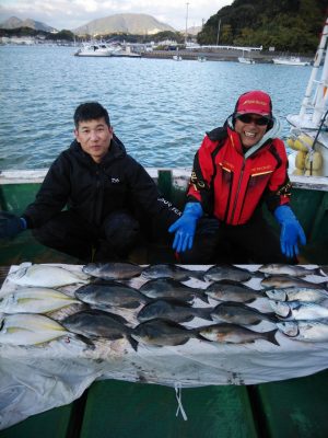 尾長グレ、40㎝を頭に6匹とヤイトガツオ、イサギ、アイゴ等々合計7目釣れて大変喜んでくれて良かったです。