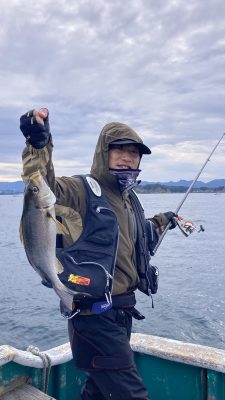 前半・中盤は仕掛けが沖へ流れて、釣り餌もほぼ取られず、生命反応無しの状態でしたが、後半は上り潮が勝り潮目が北上してきたところ、竿先が海面に突き刺さるアタリ!竿を立て直す前にバキンッと竿が折れた音と勘違いするほど音を立てて道糸を切っていきました。少し魚が相手してくれたと仕掛けを作り直し、数投の後に大きいアタリ! やり取りしながら覗き込むとキラリとシマアジが光ってました。 その後はグレも釣れてホッとしました。冷たい雨の中、お疲れさまでした。またよろしくお願いいたします。
