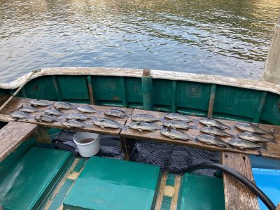 当日も早朝から喰いが良く、一投目から釣れ出しました。コンディションも良く北東風、下り潮、晴れ、波は50cm〜1m、水温19度台でした。中盤には喰いも下がりましたが、ポツポツと釣れて、2人で40匹と大釣りできました。お疲れさまでした。