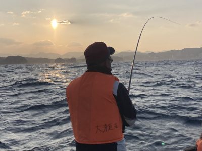 夕暮れ時は、投錨せず流し釣り。意外に流されるのが早く、投錨がよいとのことで、水深37m辺りのポイントへ移動しました。