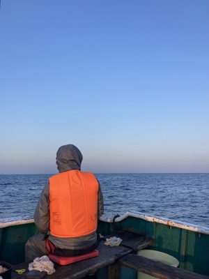ポイント到着時、北風とほぼ止まっている潮の流れ。船の振りは最小限にと、錨ロープは短く伸ばし、波の方向も良く船は安定した感じ。