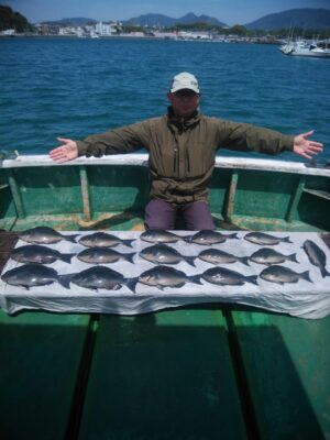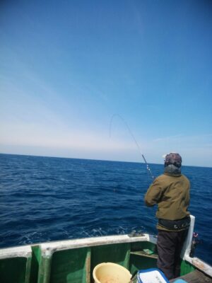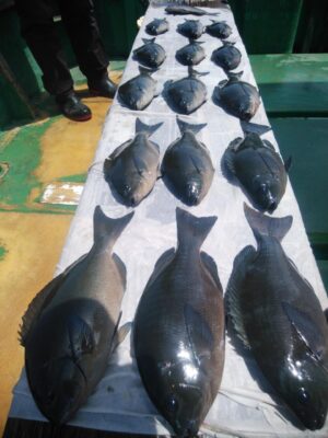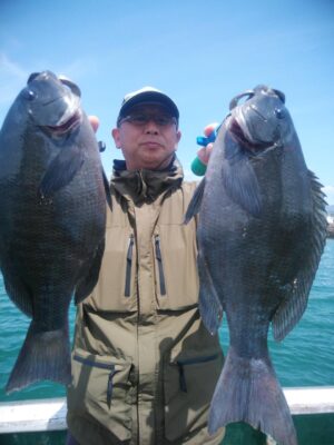 東の風で、上り潮でした。朝1番は、波高も0、5mと穏やかでした。後に岡入れの潮に変わり喰い渋りもありましたが、田岡様と船長片手間にお2人でグレ、31~40㎝を31枚釣れました。『こんな潮で釣れてよかった。。。』と田岡様