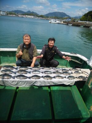 朝1番、北東の風で潮は、ほとんど止まった状態で苦戦しましたが後に上り潮に変わり流れも出てきてバタバタと喰いが活発になりグレ、38㎝を頭に21枚とイサギ交じりで良かったです