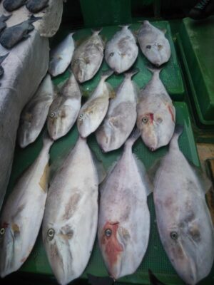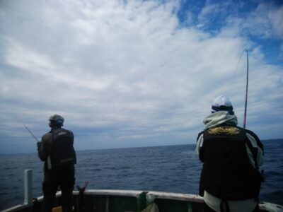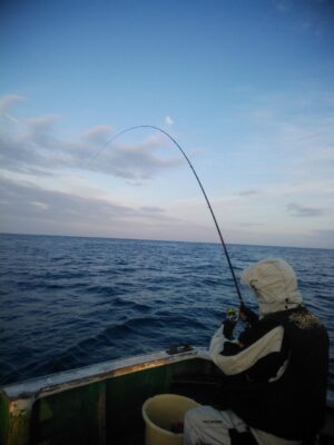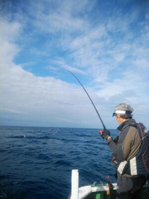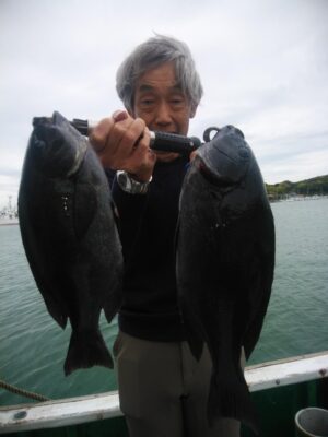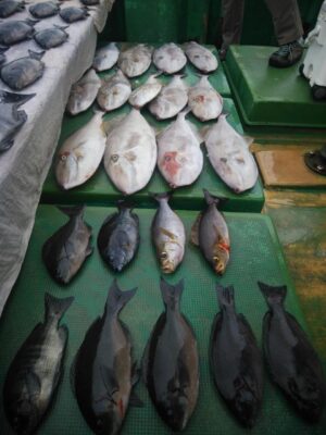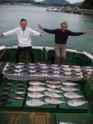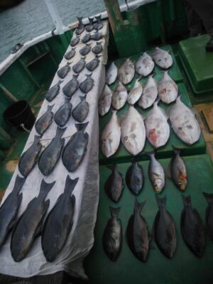 北東の風で下り潮でした。波高は、1mもないぐらいのベタナギ状態でした。山口様、前之園様、よく頑張ってくれてグレ40㎝を頭に31枚とイサギ、ウスバも交じり3目釣れて大釣りでした。『よく釣れた おもしろかった。。。』と大変喜んでくれて良かったです
