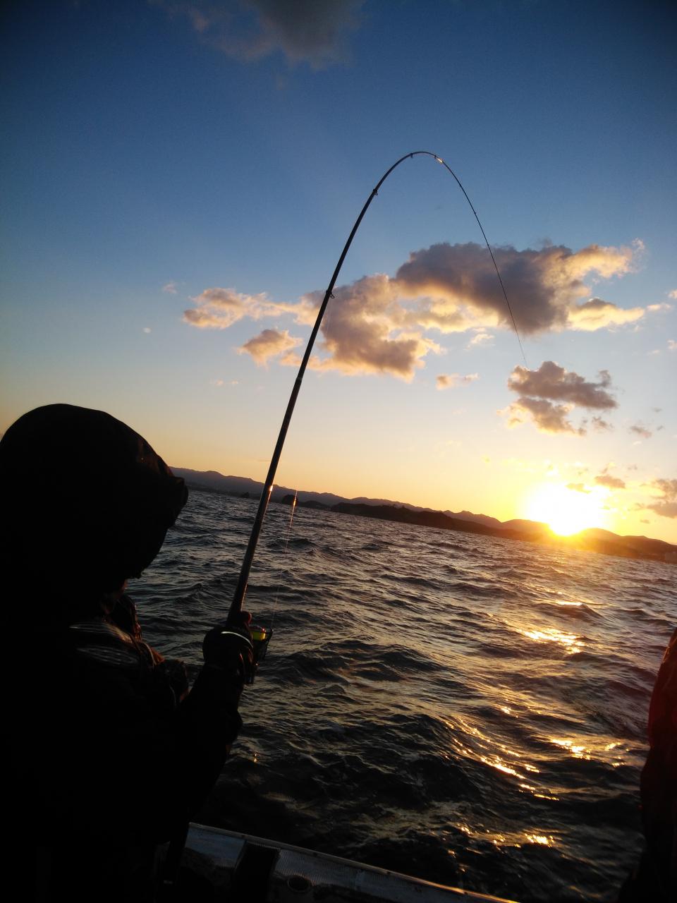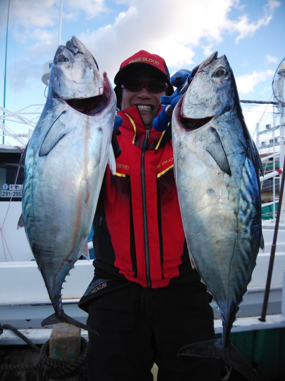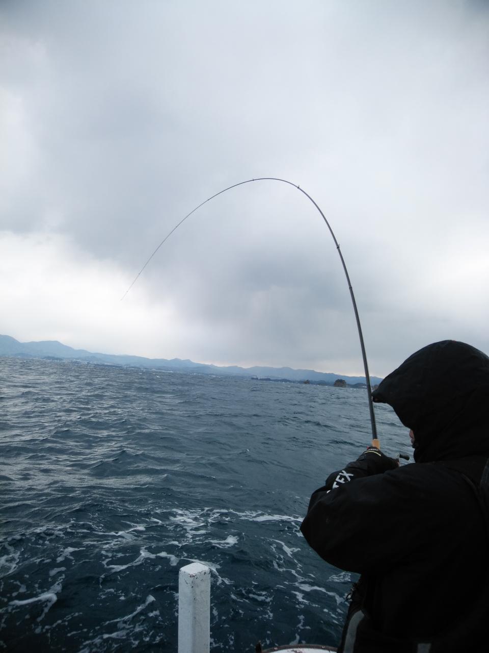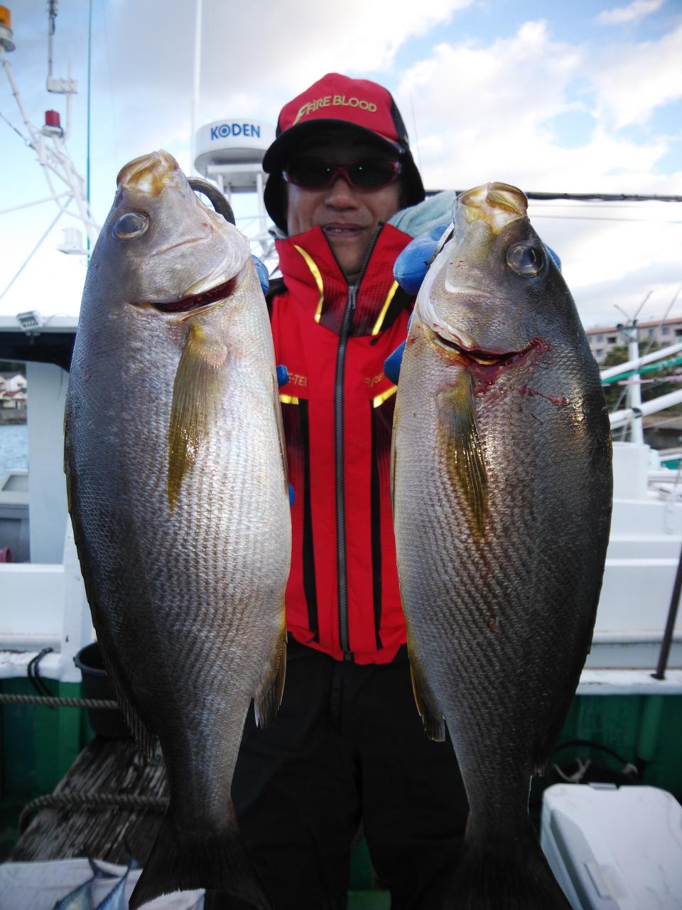 北西の風で下り潮でした。喰いが活発でシマアジ53㎝を頭に3匹、ヤイトガツオ、44㎝を頭に3匹とよく釣れましたが5~6発ブチ切られました