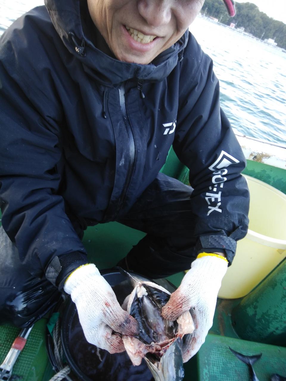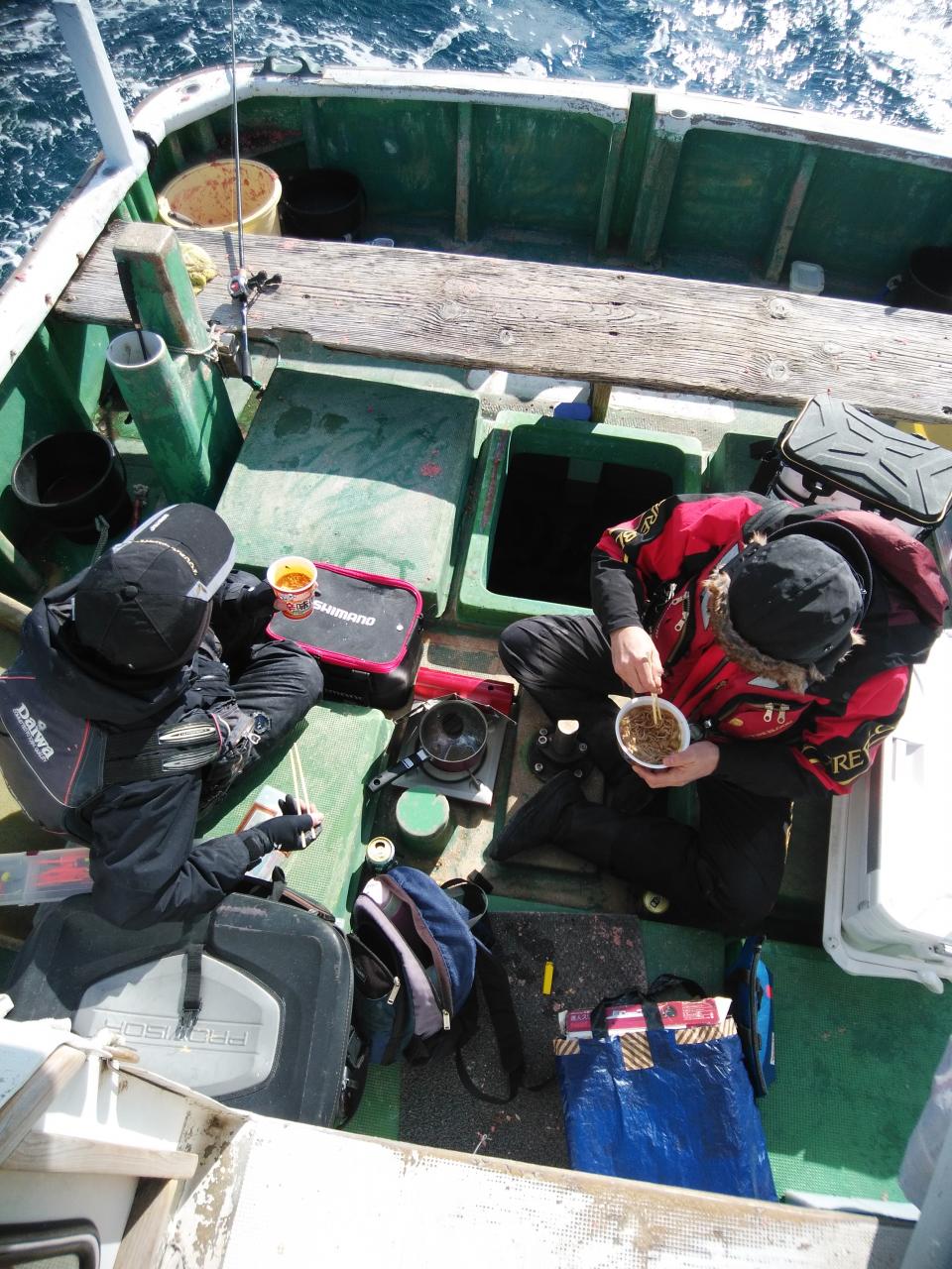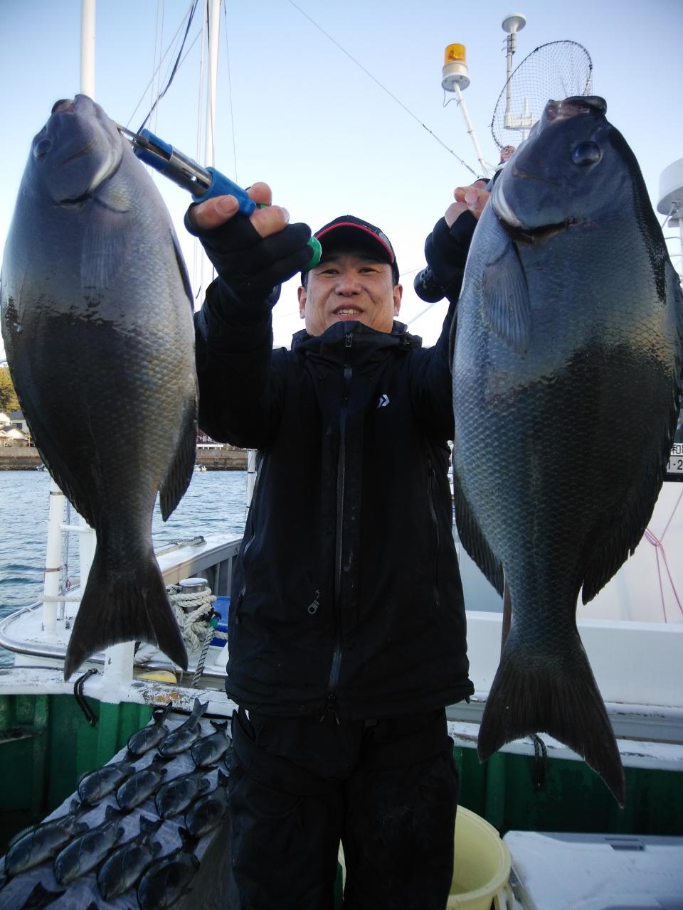 北西の風で下り潮が速すぎるぐらいの速さでしたが、熊取谷先生、小深田先生よく頑張ってくれて寒グレ、43㎝を頭に65枚の大漁、大釣りで、お昼には、先生方ガスコンロ使ってラーメンを美味しく頂いていました。