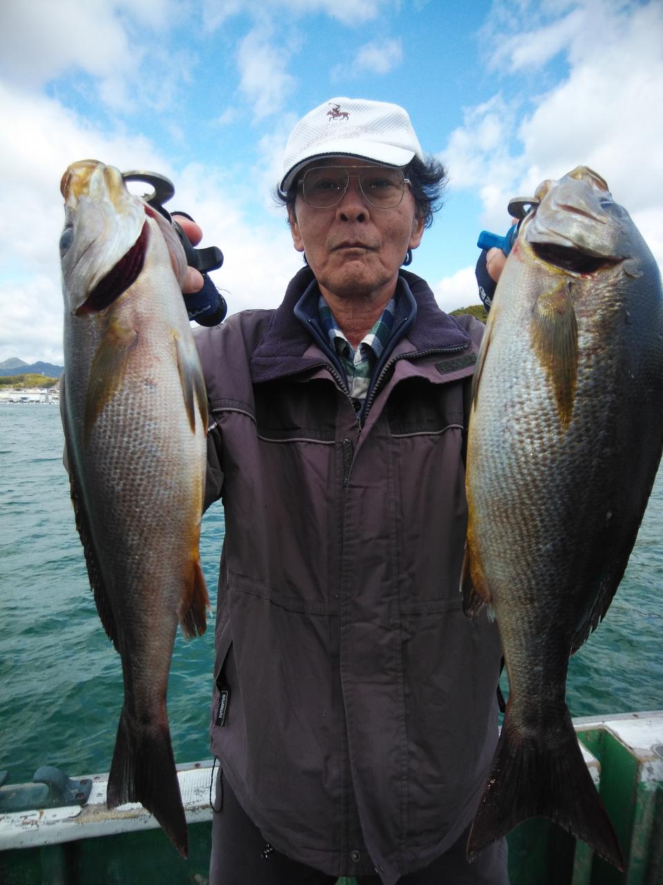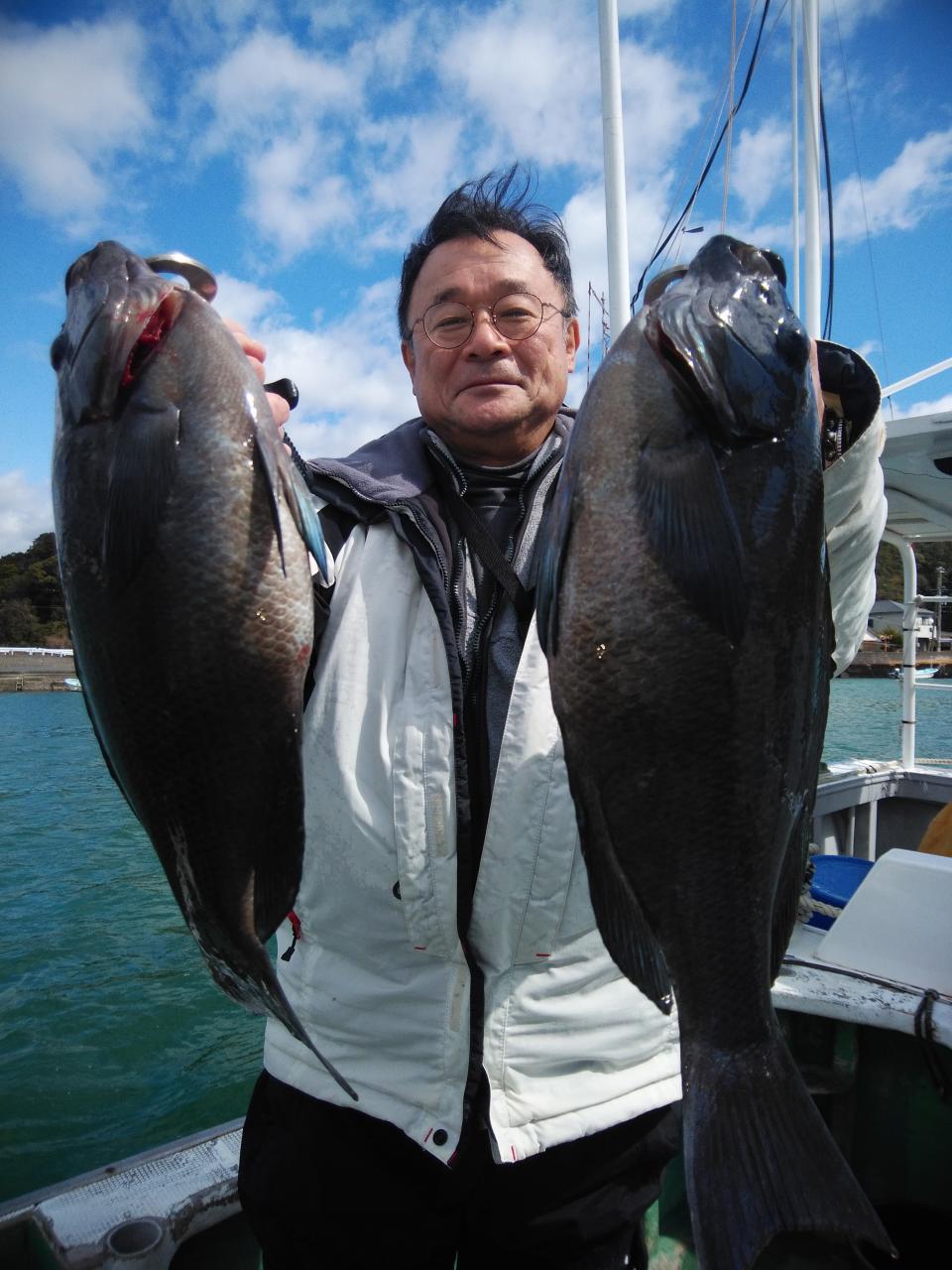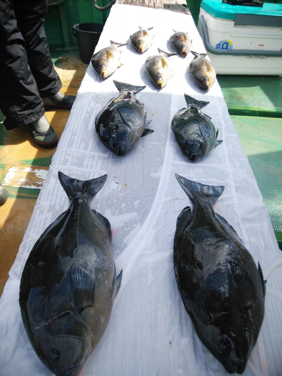 朝1番、北西の風で、上り潮でした。風と潮とが反対で釣りづらかったのですが、堀内様ら良型イサギ、バタバタと5匹釣ってくれました。後に潮が止まり喰い渋りが続きましたが後に下り潮に変わってよく変化しました。針外れやブチ切られも数回ありました。風と潮とが同調すれば今後楽しみです。ありがとうございました。またよろしくお願いします