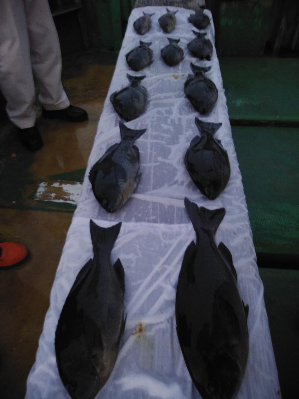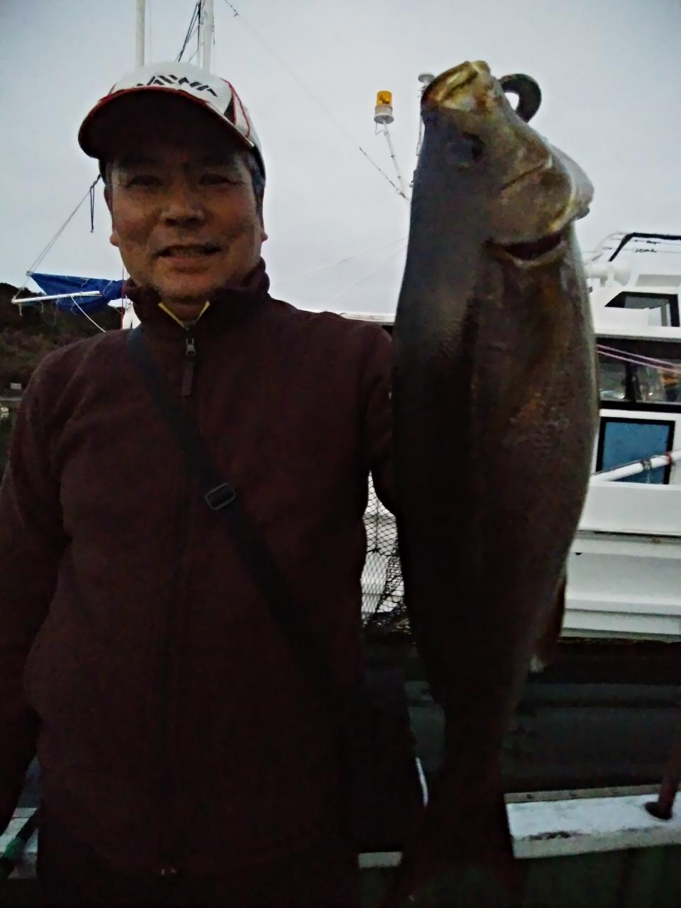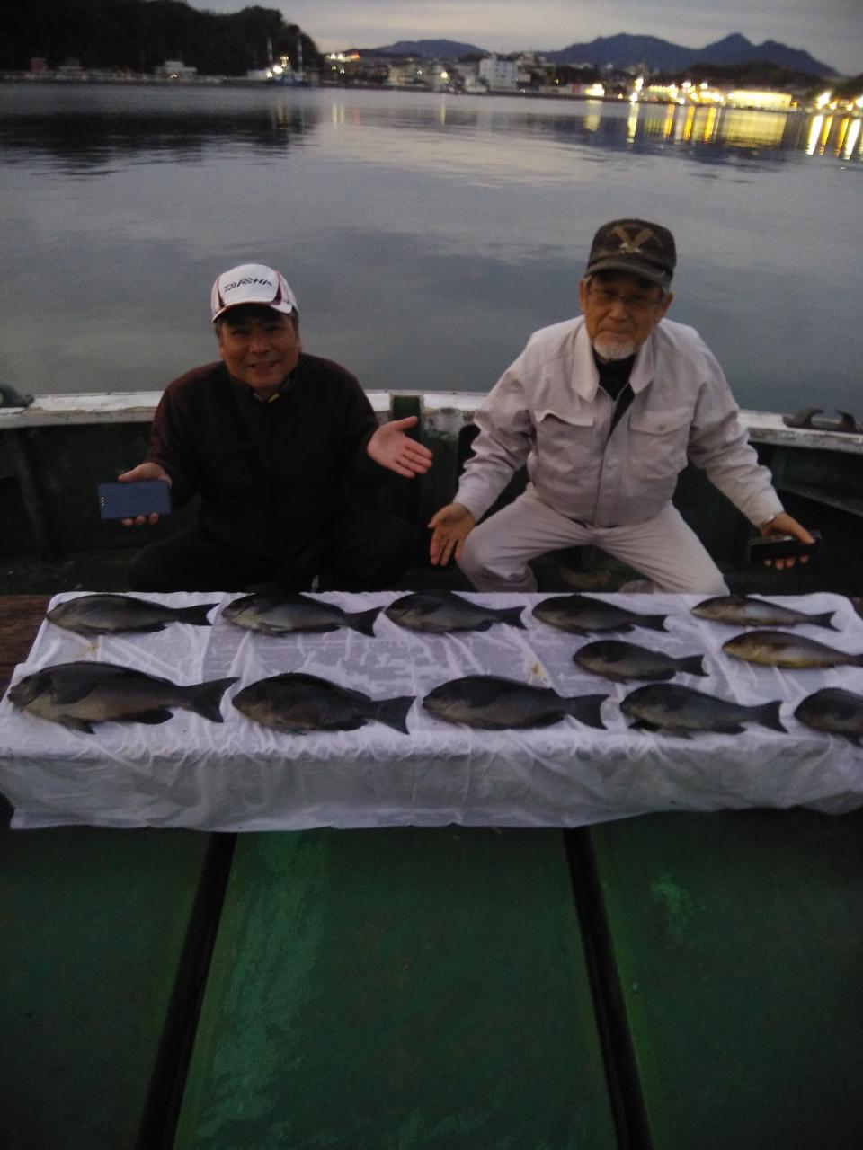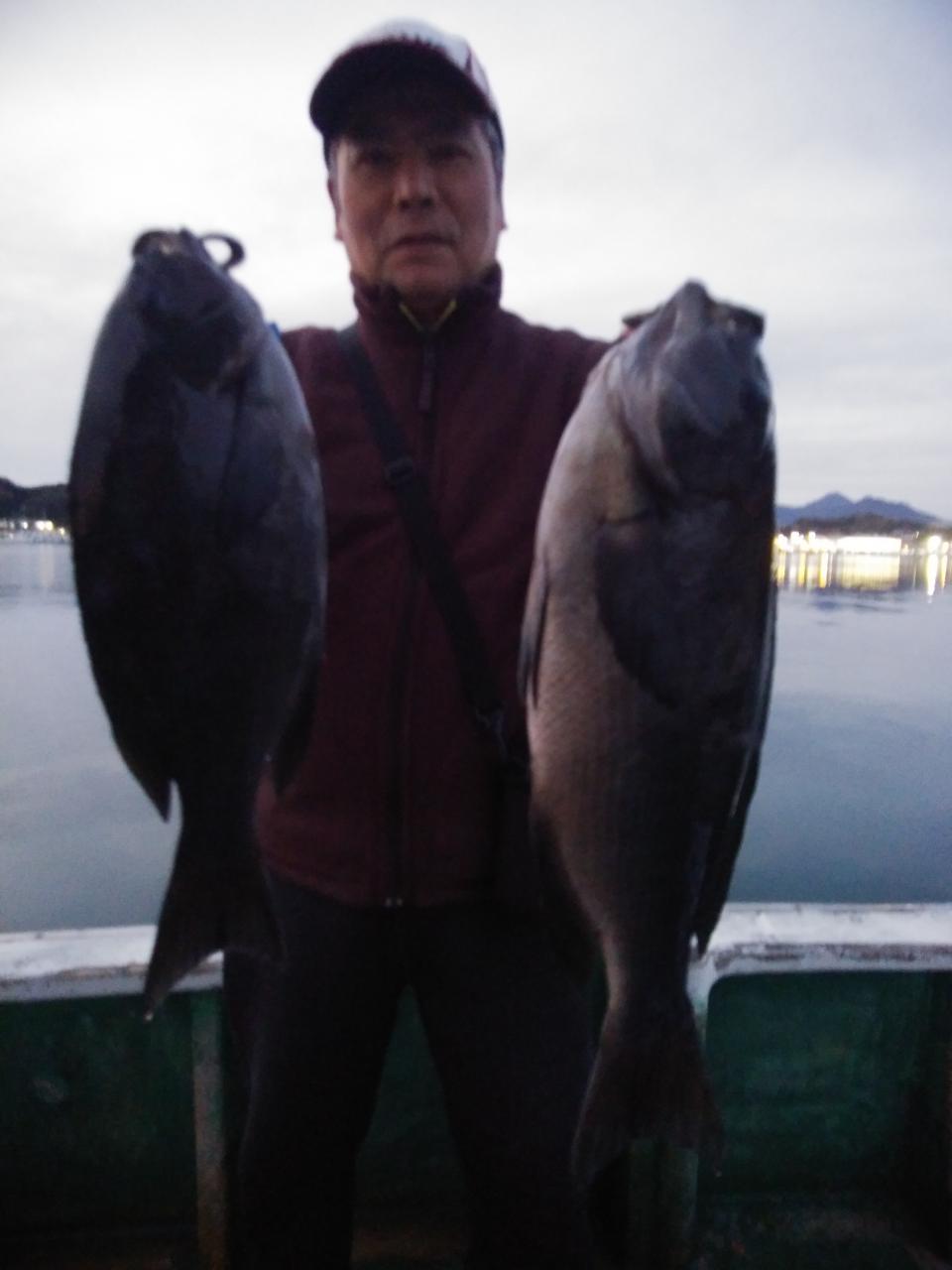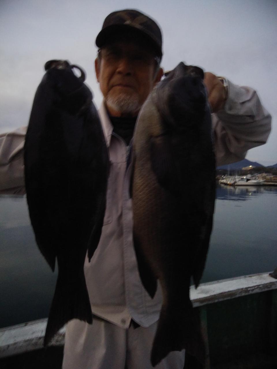 北西の風で岡入れの下り気の潮でした。潮の遅い時もあり、釣った匹数ぐらい針外れやブチ切られが多発しました。川﨑様らよく頑張ってくれて寒グレ、今年2番目に大きい45㎝釣れました。寒グレ、45㎝を頭に10枚とジャンボイサギ、40㎝も交じり喜んでくれて良かったです。ありがとうございました。またよろしくお願いします