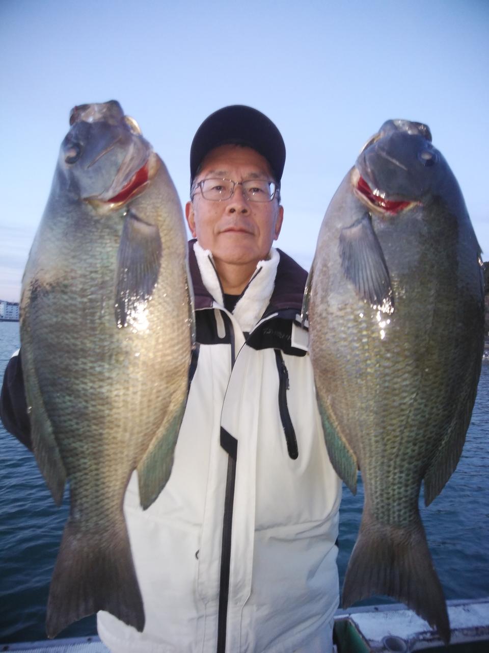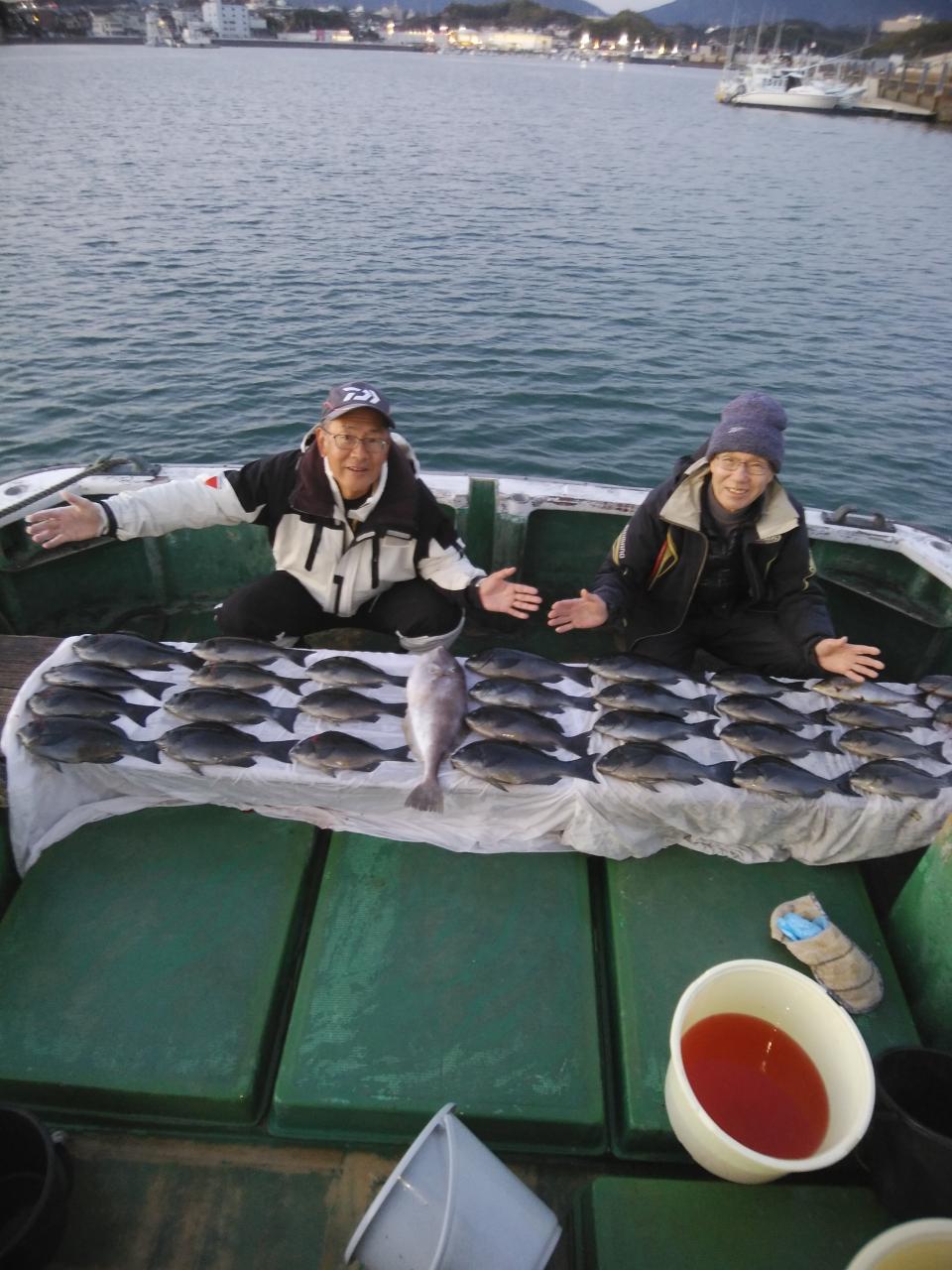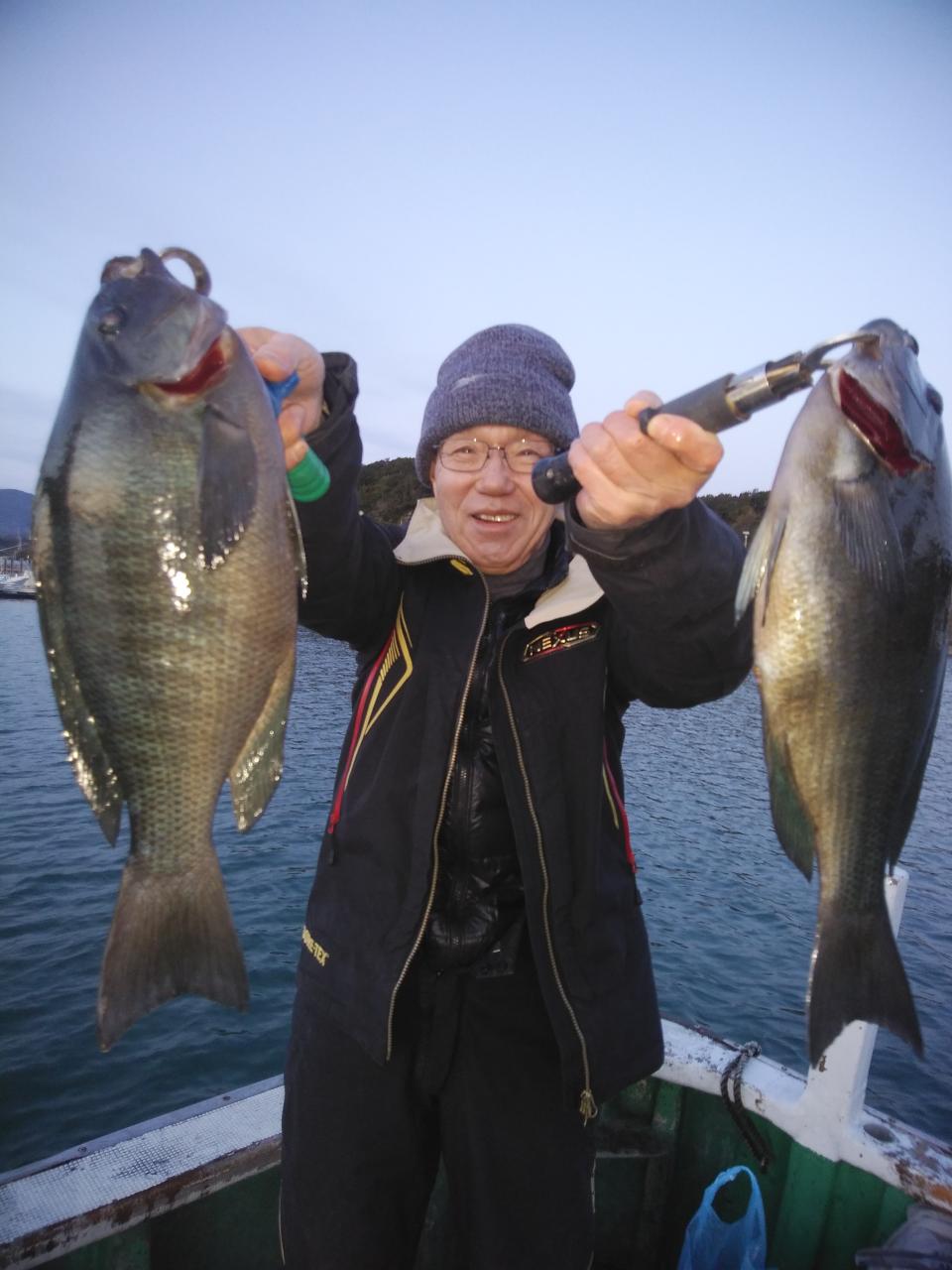 朝便は、北の風で、上り潮でした。風と潮とが反対で苦戦しましたが、昼便は、北西の風で、岡入れの潮に変わっていました。1投目、2投目から釣れましたが目にスレで上がって来たり針外れが多数回ありましたが此上様らよく頑張ってくれて寒グレ、40㎝を頭に30枚釣れて大変喜んでくれて良かったです。これから楽しみです。