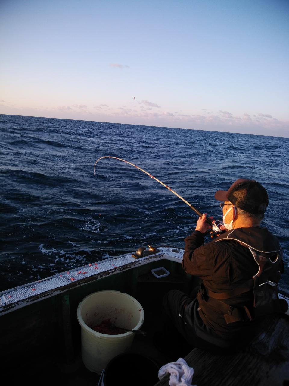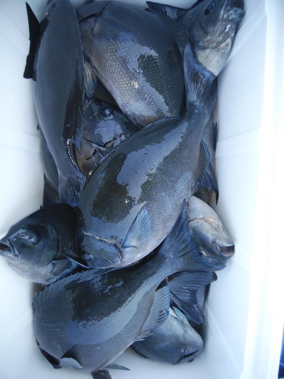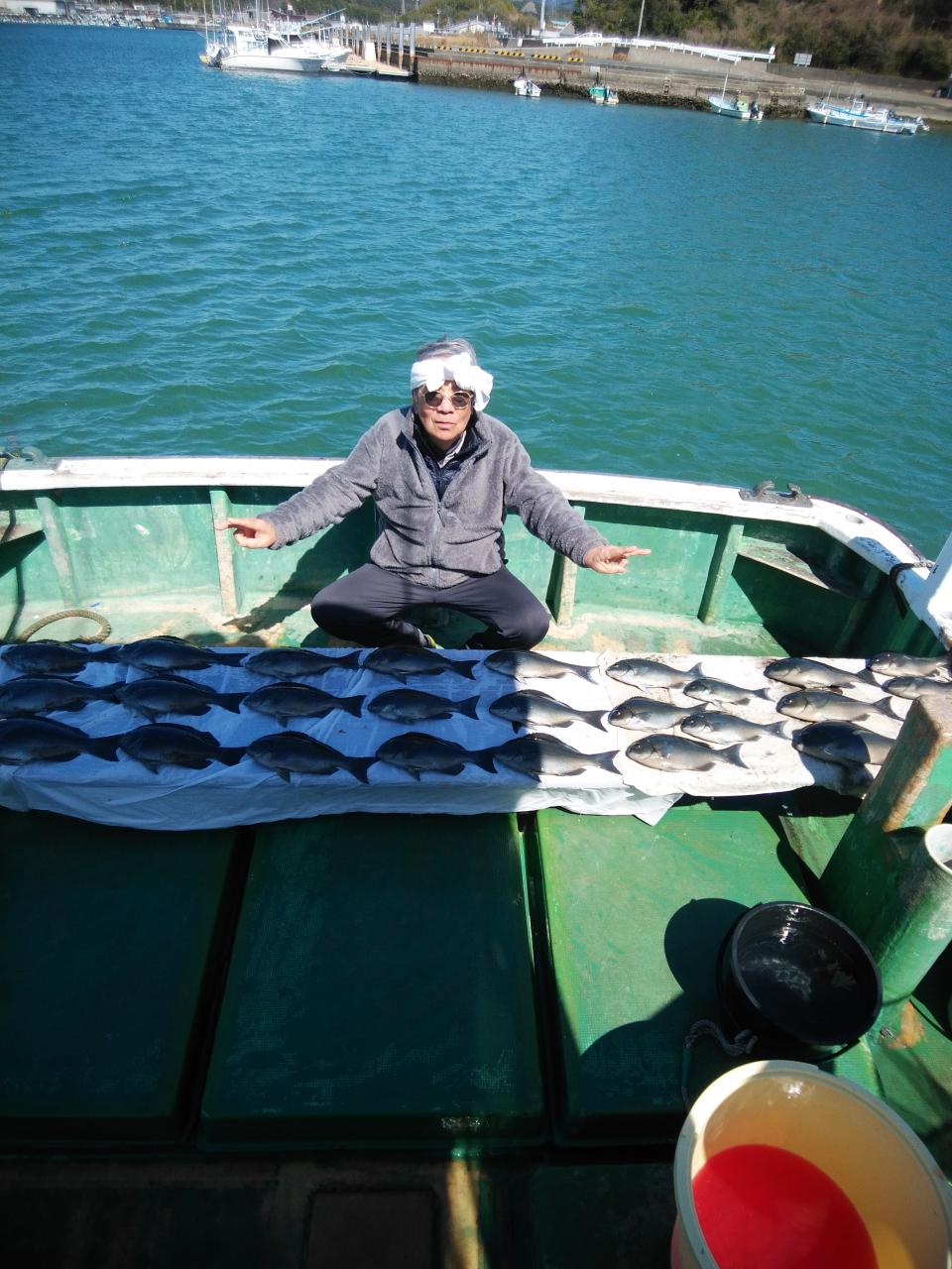 北西の風で、下り潮でした。風と潮とが同調していて田中様、石丸様、42㎝頭に27枚釣ってくれて良かったです。寒グレ、白子パンパンで吹き出していました。