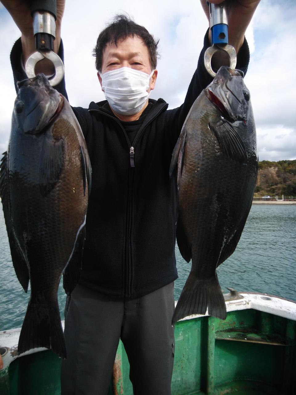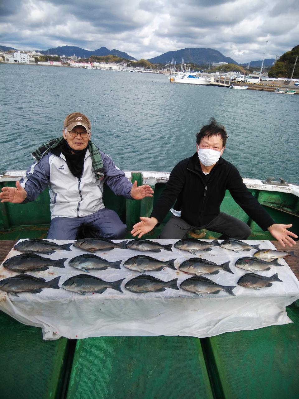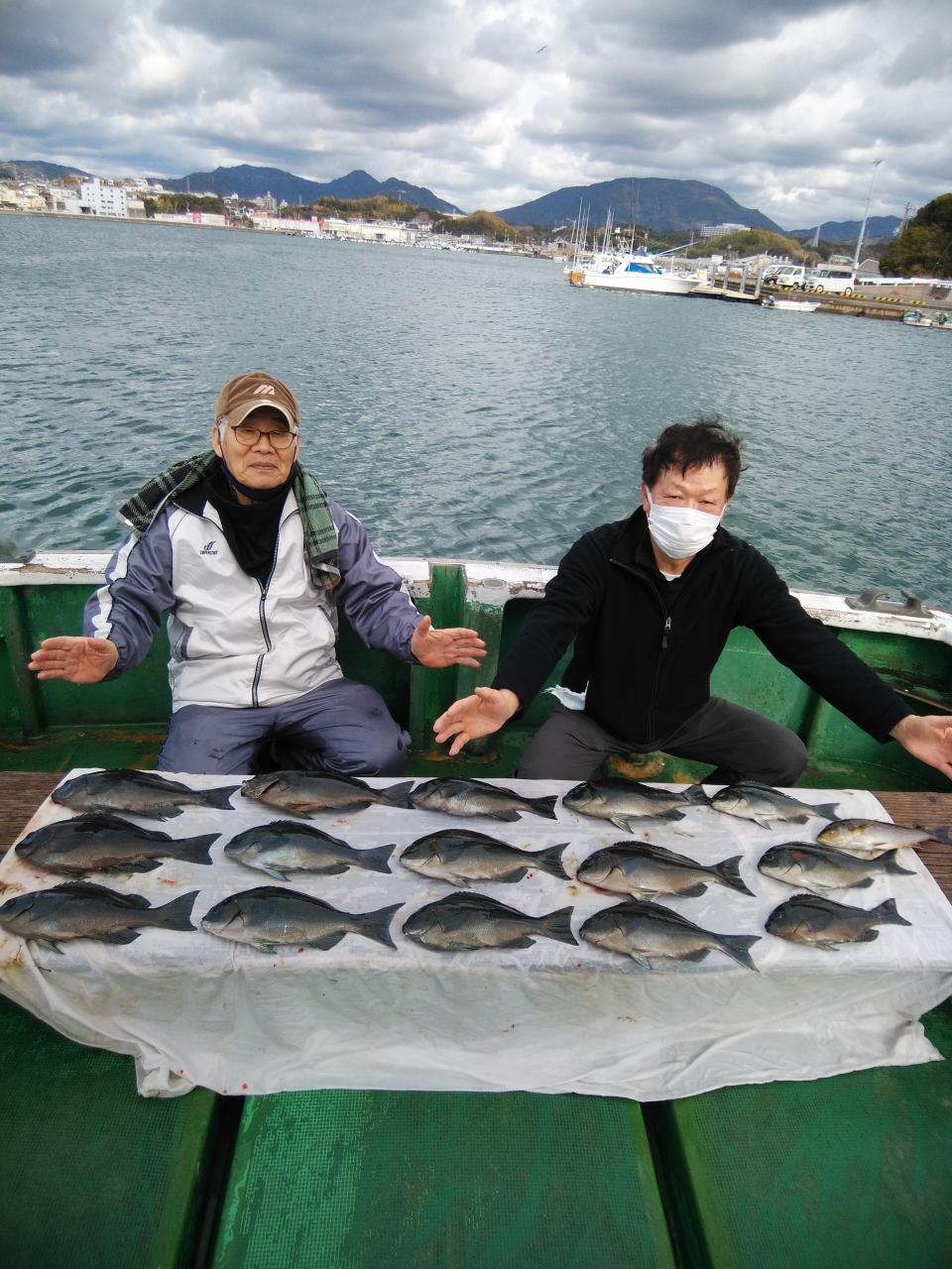 北東の風で、下り潮でした。のちに南西の風に変わり風と潮とが反対で釣りづらい状態でも岡井様らよく頑張ってくれて寒グレ、38㎝を頭に15枚釣れて良かったです。