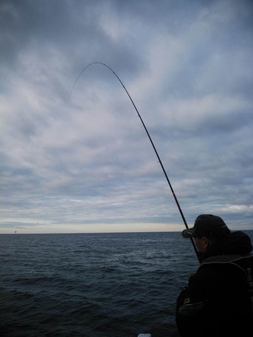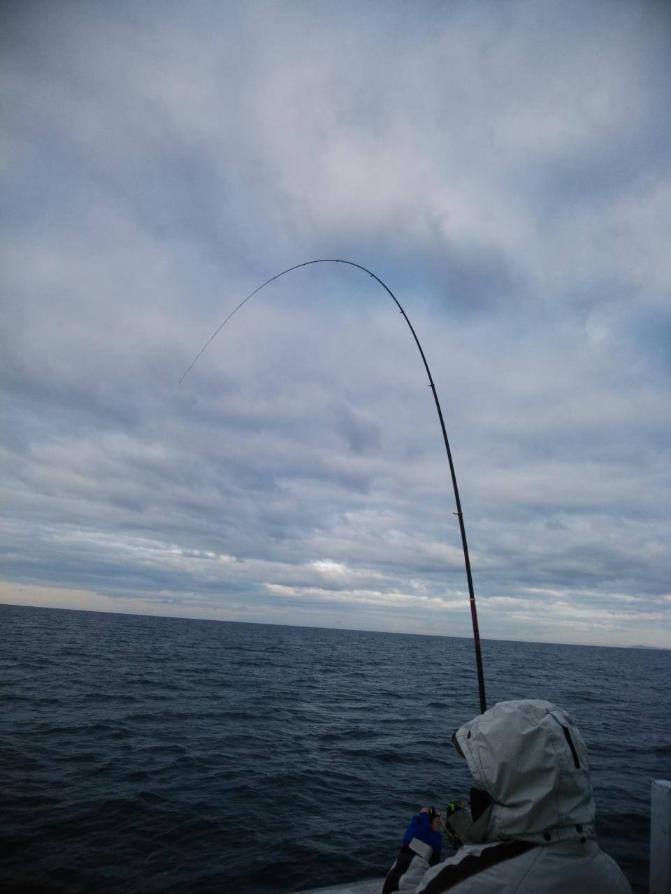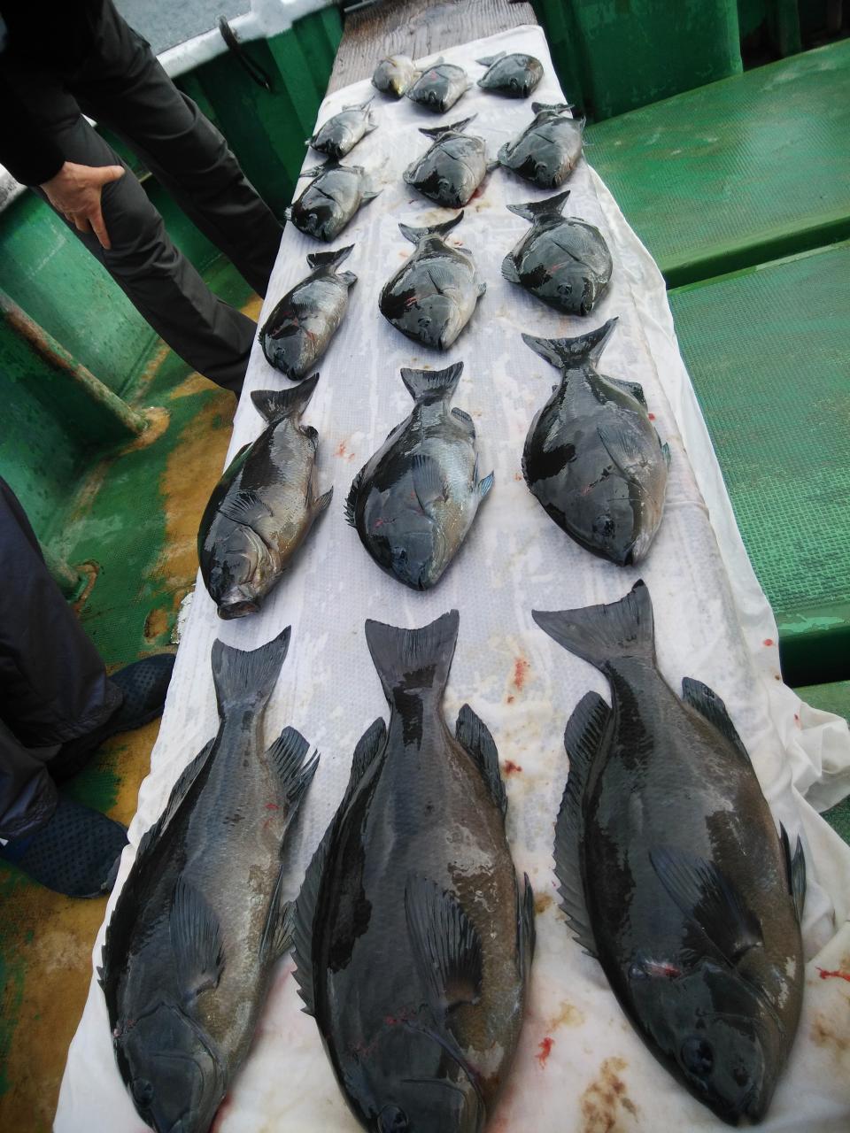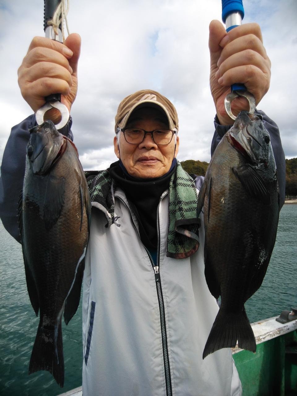 北東の風で、下り潮でした。のちに南西の風に変わり風と潮とが反対で釣りづらい状態でも岡井様らよく頑張ってくれて寒グレ、38㎝を頭に15枚釣れて良かったです。