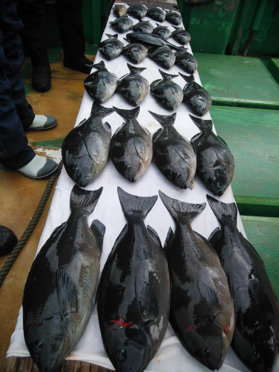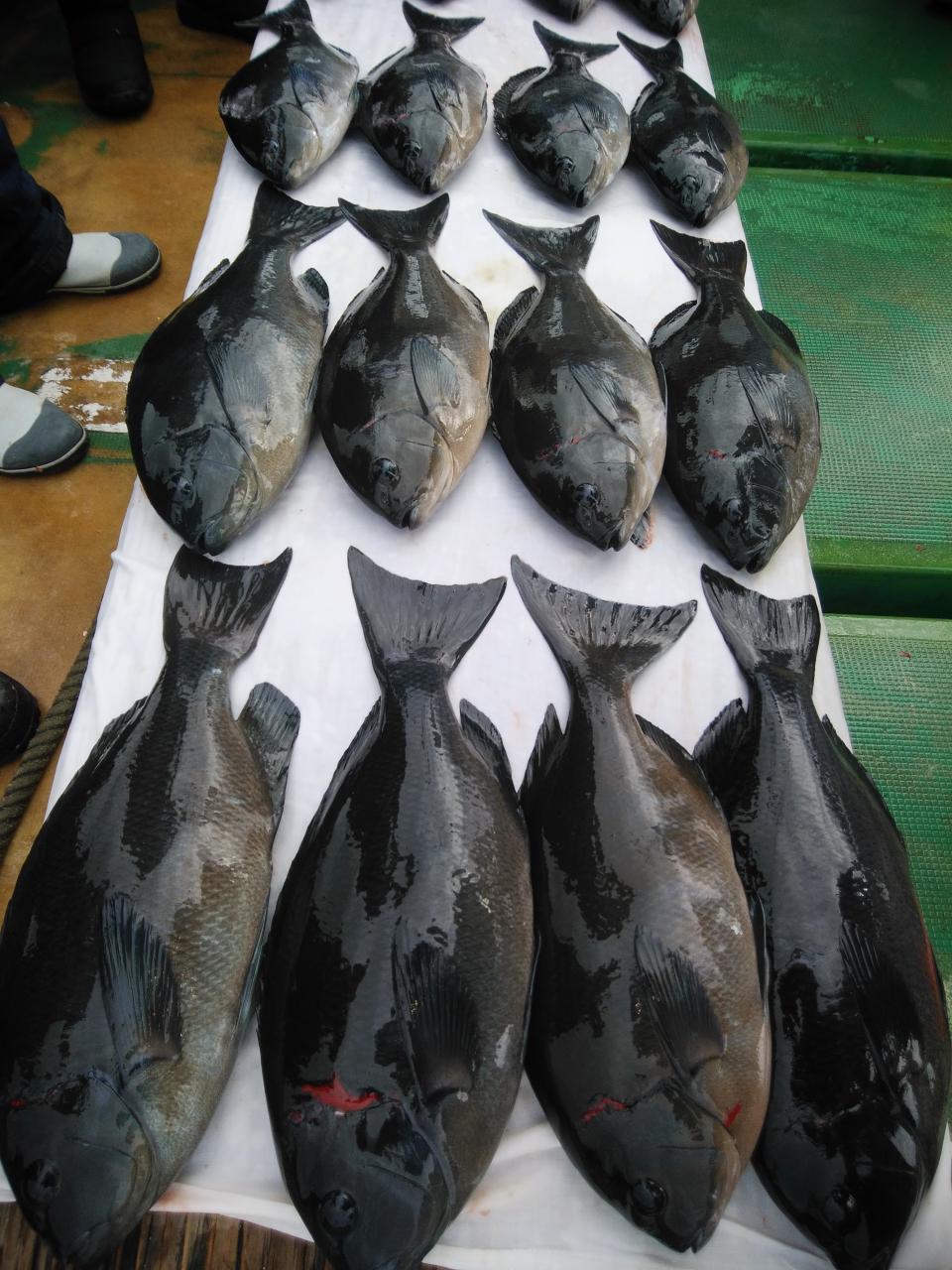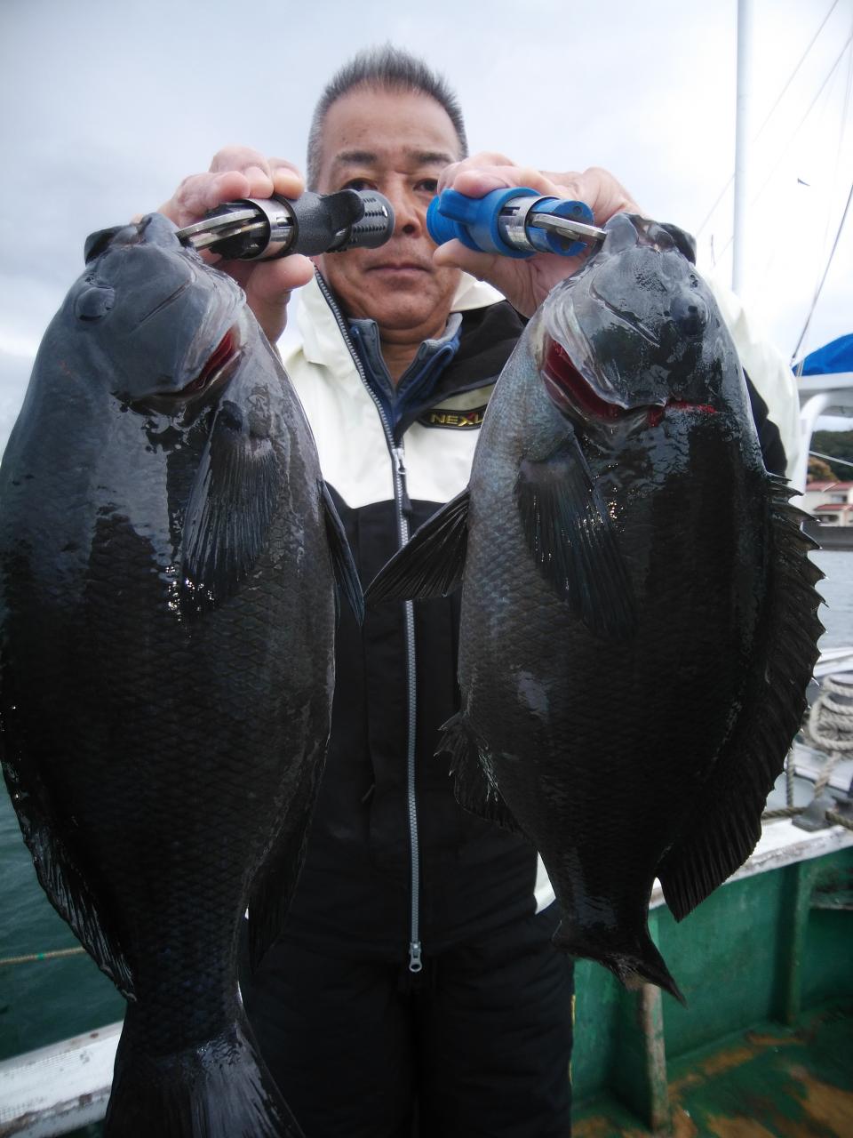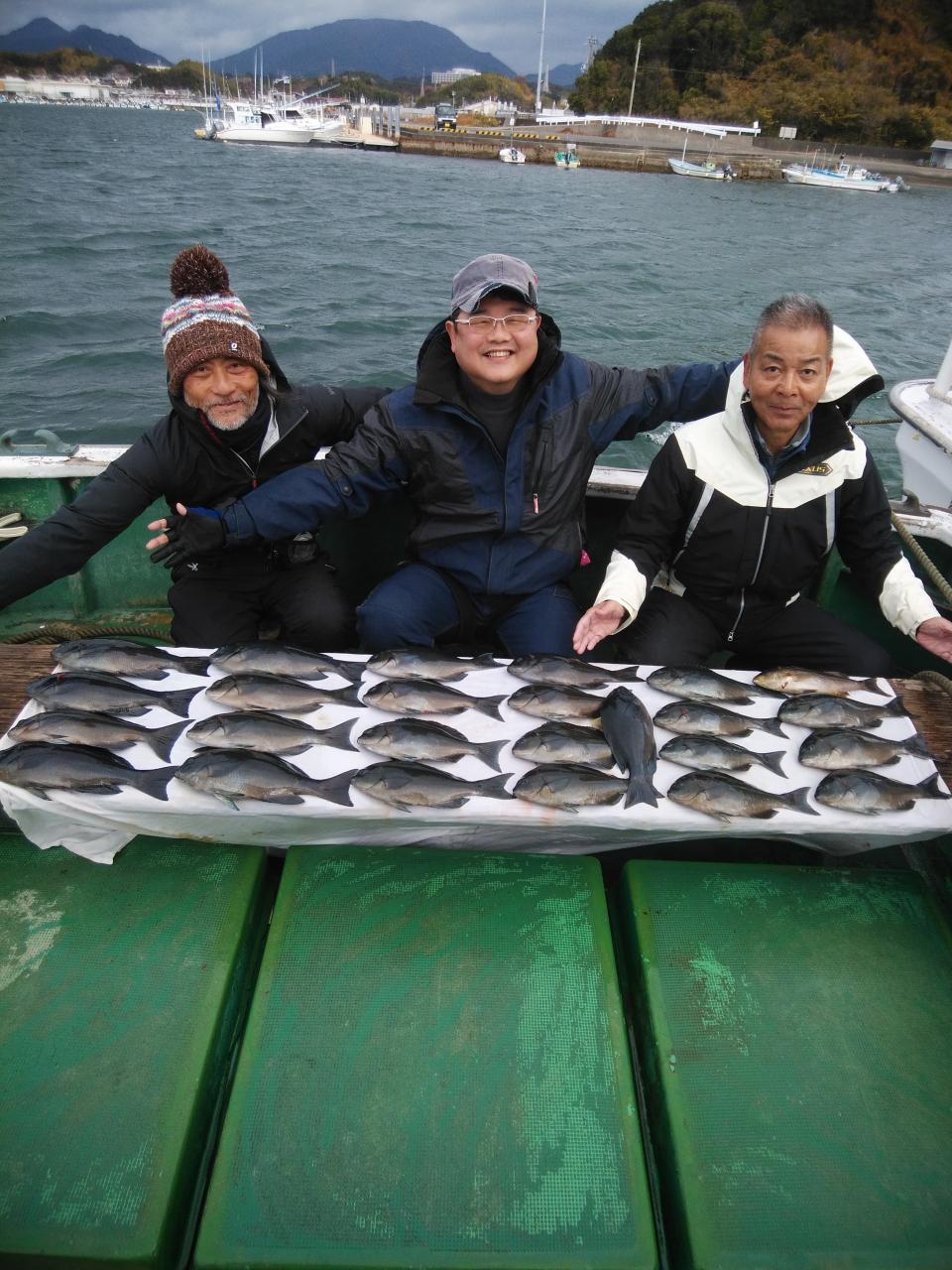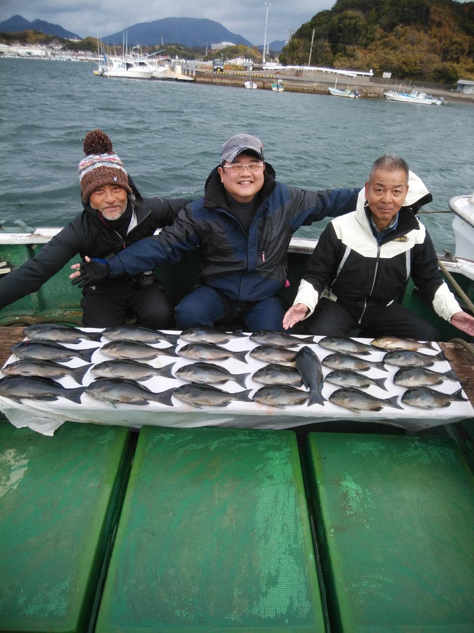 最初は北西の風で、下り潮の速い流れで苦戦しましたが、田村様らよく頑張ってくれて寒グレ、40㎝頭に24枚、 イサギ、37㎝も交じりました。