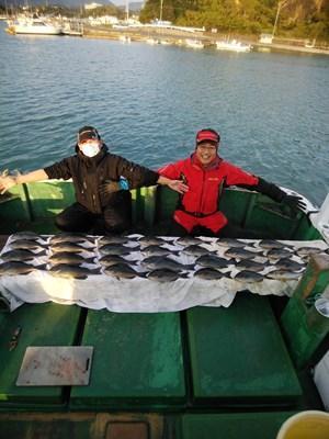 北の風で下り潮でした。喰い活発で後半は北西の風で岡入れの潮でしたが、小深田先生、熊取谷先生よく頑張ってくれてグレ43cmを頭に36枚の大釣りで良かったです。船長もお裾分けをいただきありがとうございました。カツオ、ヒラズマも交じり良かったです。