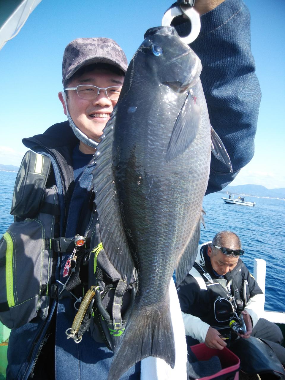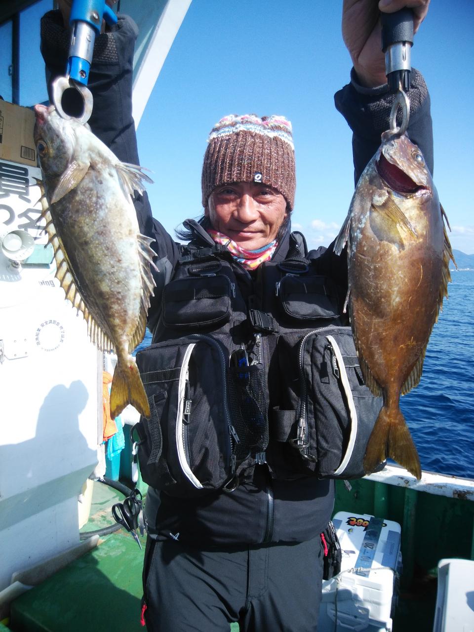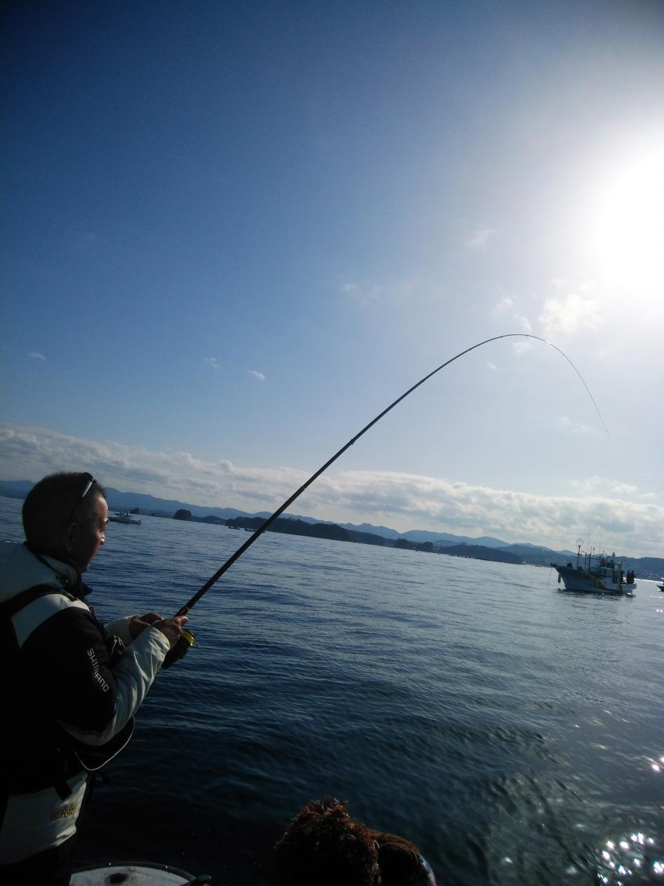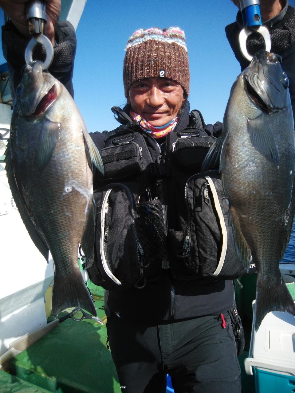 北東の風で、ベタナギで潮が遅くて苦戦しましたがよく頑張ってくれて寒グレ、40㎝を頭に7枚とイサギも交じり4目上がりました。