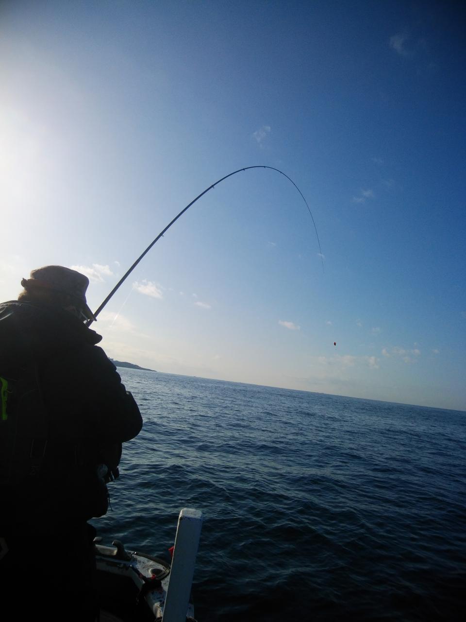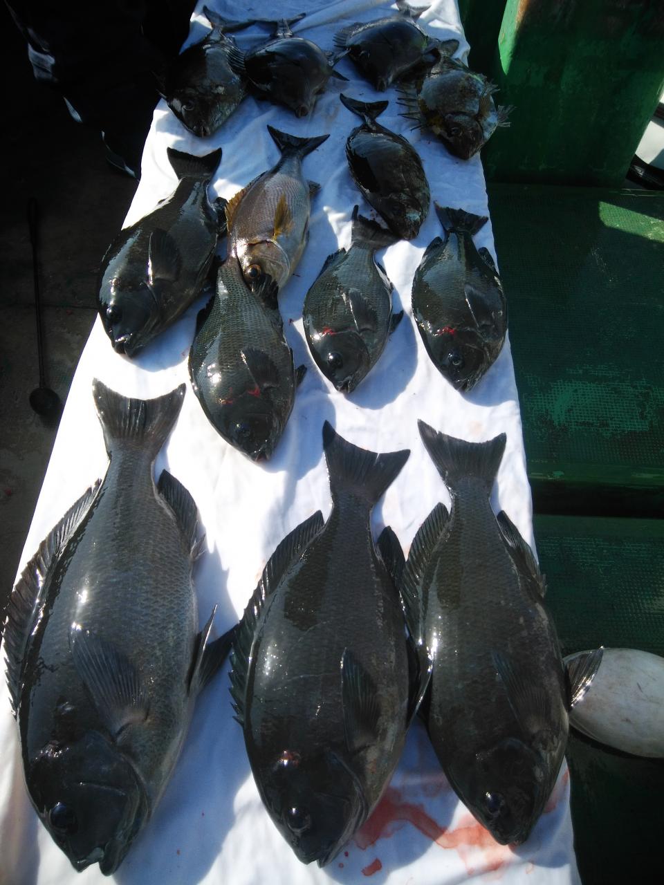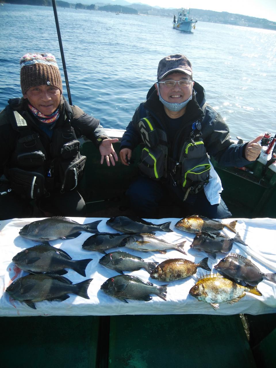 北東の風で、ベタナギで潮が遅くて苦戦しましたがよく頑張ってくれて寒グレ、40㎝を頭に7枚とイサギも交じり4目上がりました。