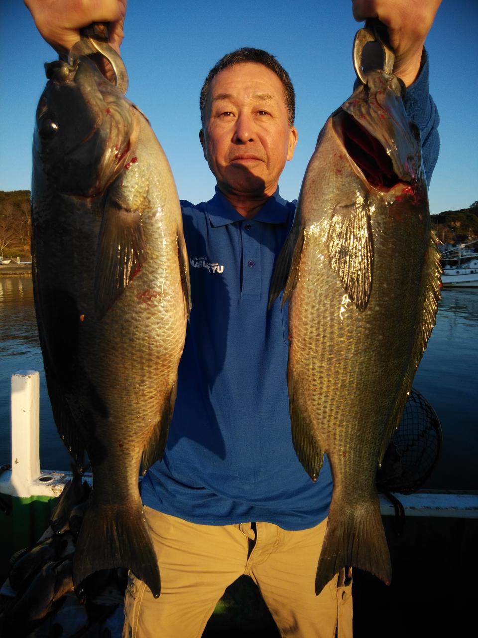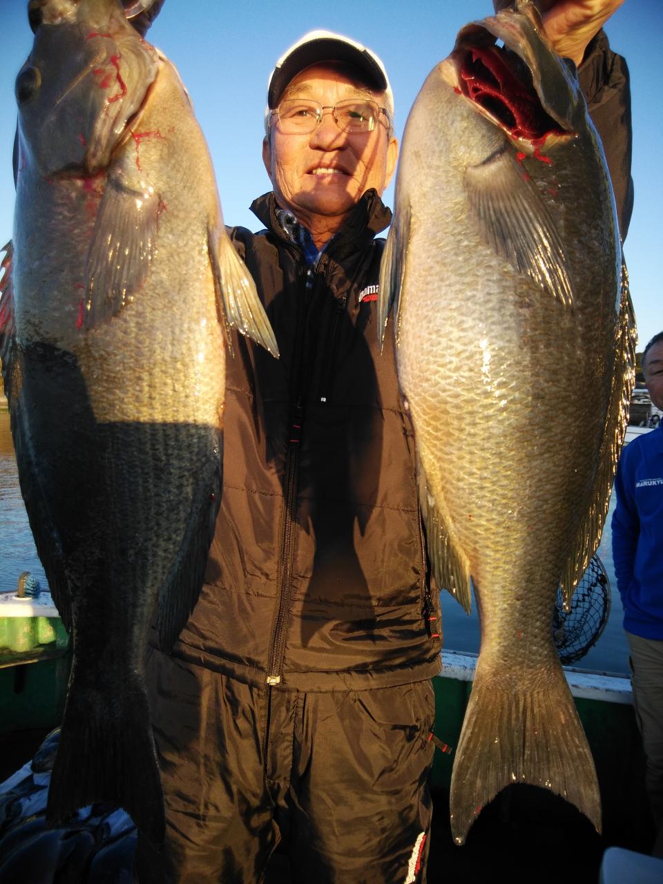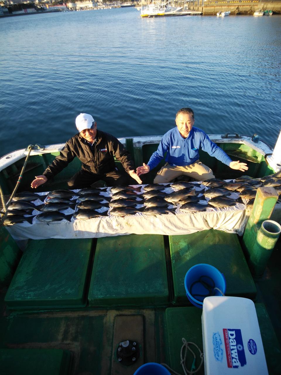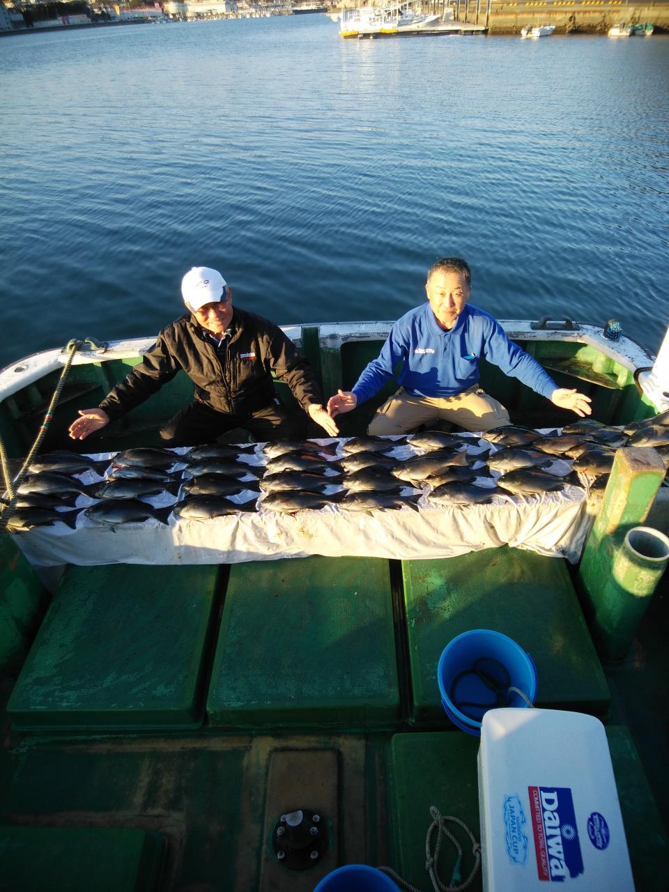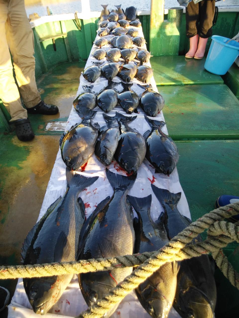 西の風で、岡入れの止まったような潮で杉本様『今日は、ボーズやなあ。。。』とそのぐらい止まったような潮でした。2時間ぐらいすると南西の風に変わり流れも川のように速い上り潮に変わりましたがお客様の腕良し!自然界も味方につけて、寒グレ、45cmを頭に37枚の大釣りで大変喜んでくれて良かったです。船長にもお裾分け頂きありがとうございました。これから寒グレ楽しみです。〈浮きグレもたくさんありました〉