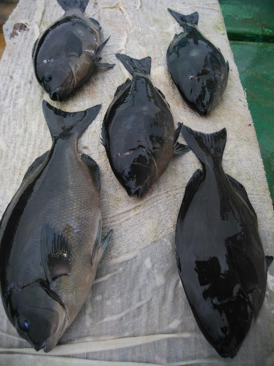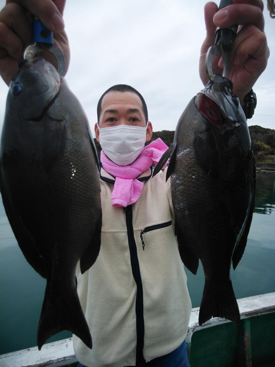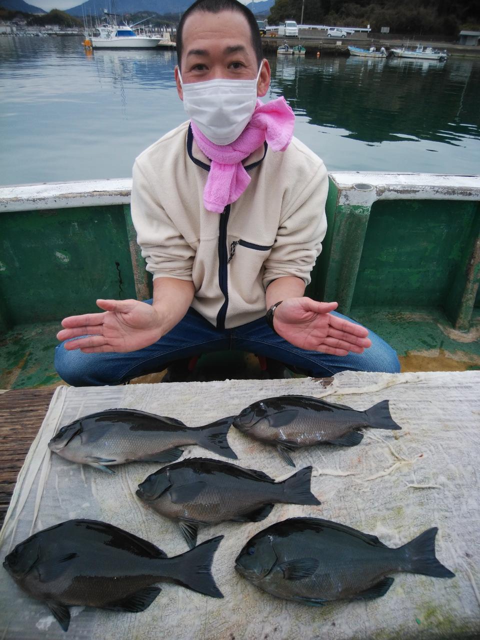 北の風で、上り潮でした。風と潮とが反対で釣りづらかったです。のちに北東の風に変わりましたが、潮は上り潮で変わらずでしたが、大鋸様よく頑張ってくれて寒グレ、37㎝を頭に5枚とシマアジ交じりで4目釣れました。雨も昼まで降らず良かったです。ありがとうございました。またよろしくお願いします。