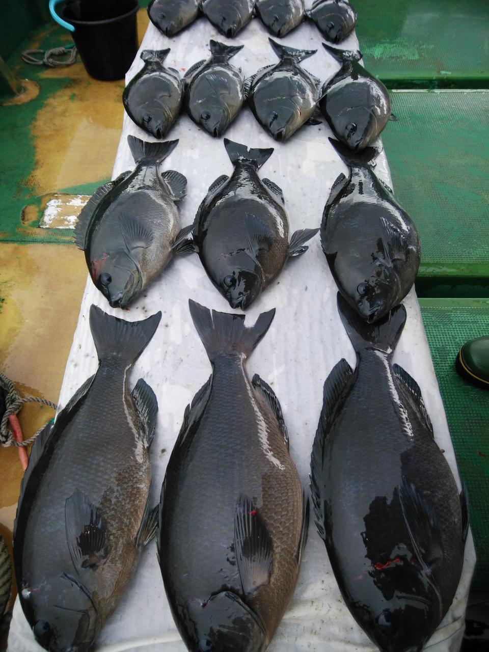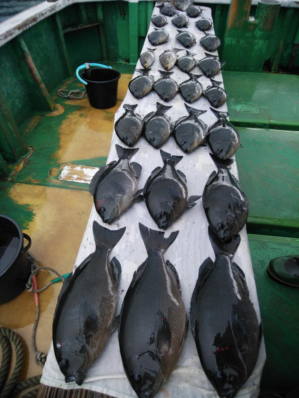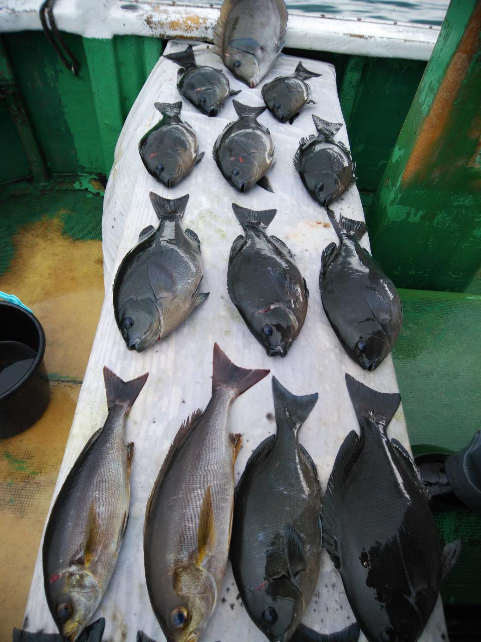 朝1番、潮が止まっていました。最初は苦戦しましたが後半、下り潮に変わり田中様らよく頑張ってくれて寒グレ、42㎝を頭に24枚、腹パンパンで釣った瞬間でも白子出し続け船中真っ白になるぐらいの勢いでした。イサギも交じり大変喜んでくれて良かったです。