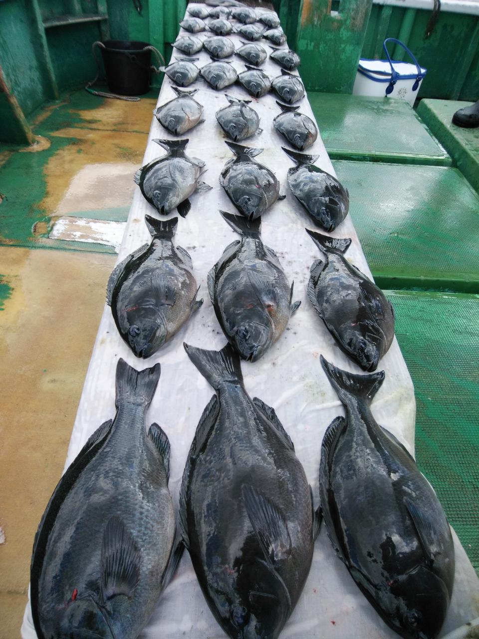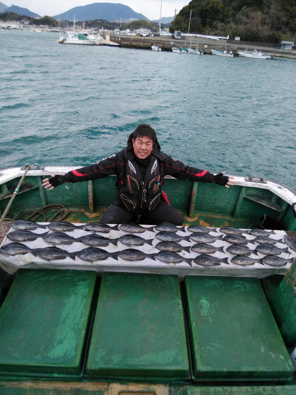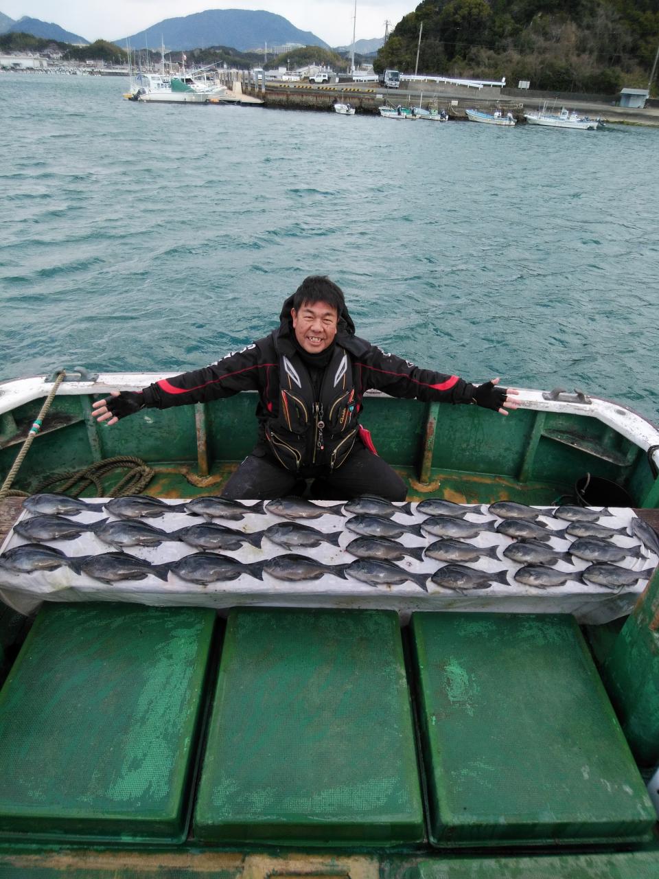 北西の風で、下り潮でした。風と潮とがマッチしていて喰いが活発でした。下尾様29枚と活かした寒グレ22枚。2名様で51枚の大釣りで大変喜んでくれて良かったです。