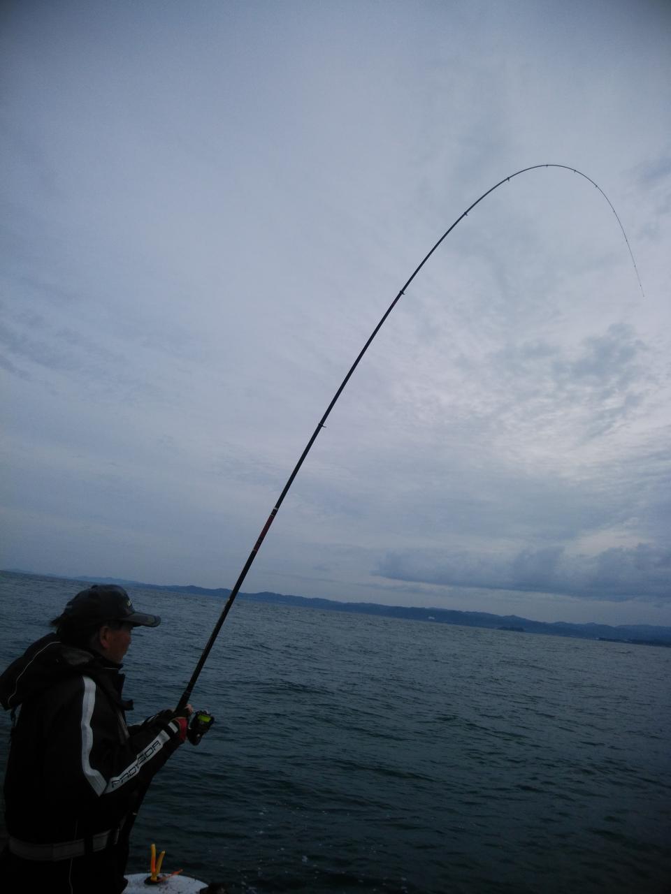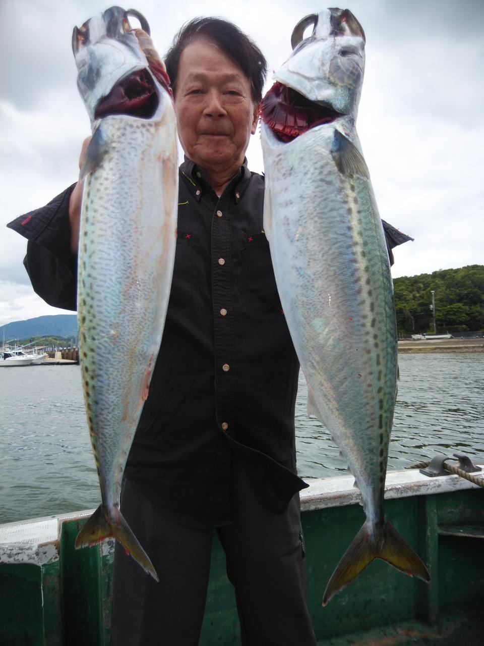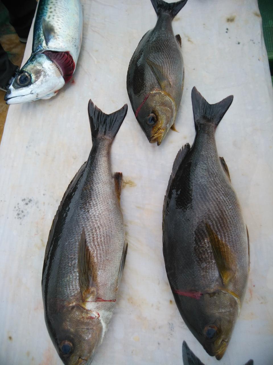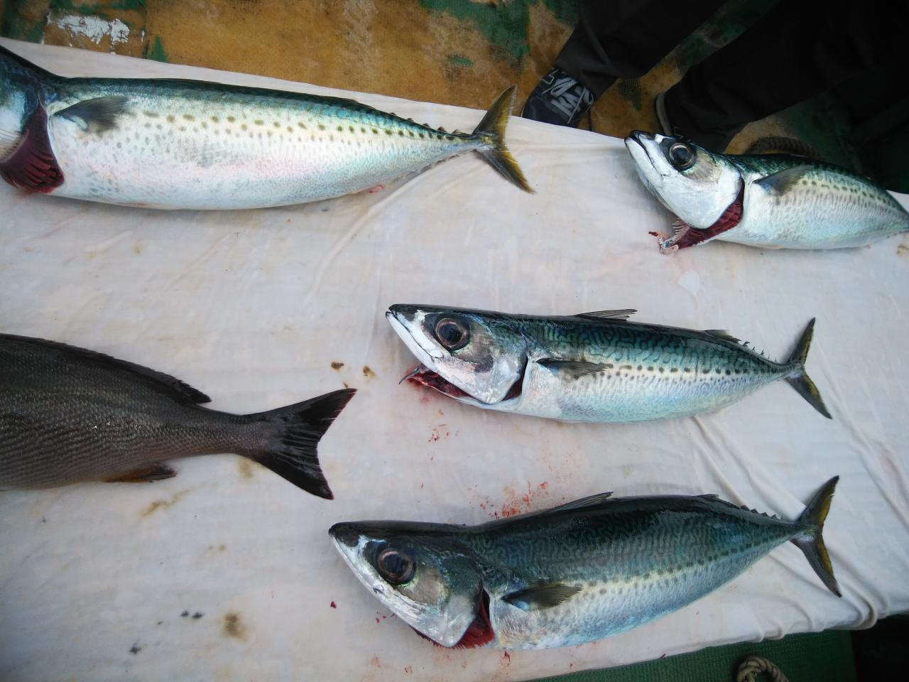北西の風で、上り潮が川のように速く釣りづらかったですが、岡井様よく頑張ってくれて尾長グレ、脂ノリノリの38㎝を頭に2匹と抱卵イサギ、腹パンパンの太ったジャンボ級39㎝を頭に3匹と特大サバ、4本で3目釣れて大変喜んでくれて良かったです。