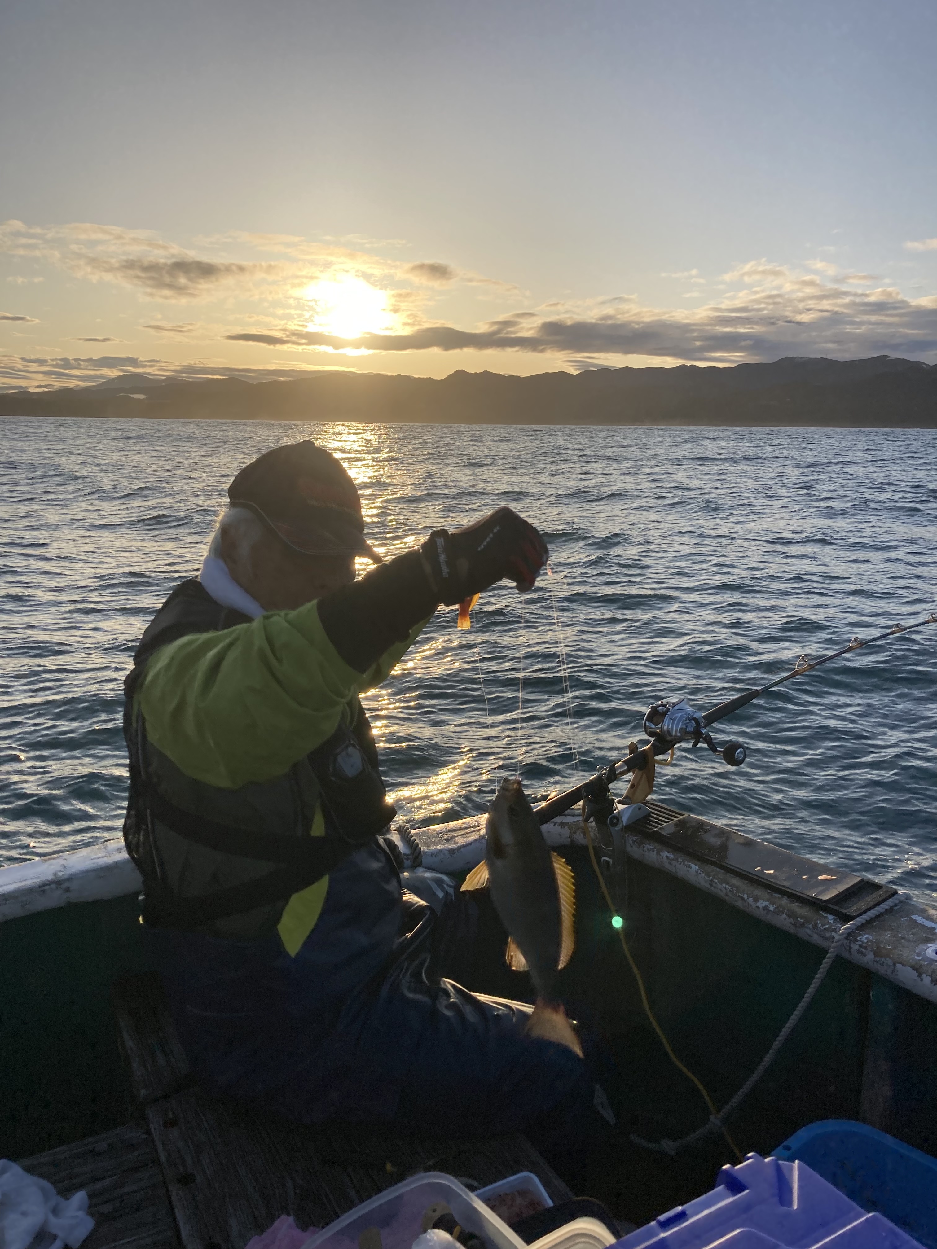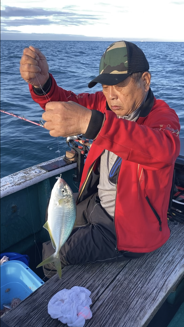 7時を過ぎる頃には、イサキが掛かるが、海のギャングが現れたのか、イサキを横取りされるのが続きました。その周辺には水潮みたいな潮目もあり、ちょうどいいかなと、錨を上げてポイント移動(ギャングを回避)しました。