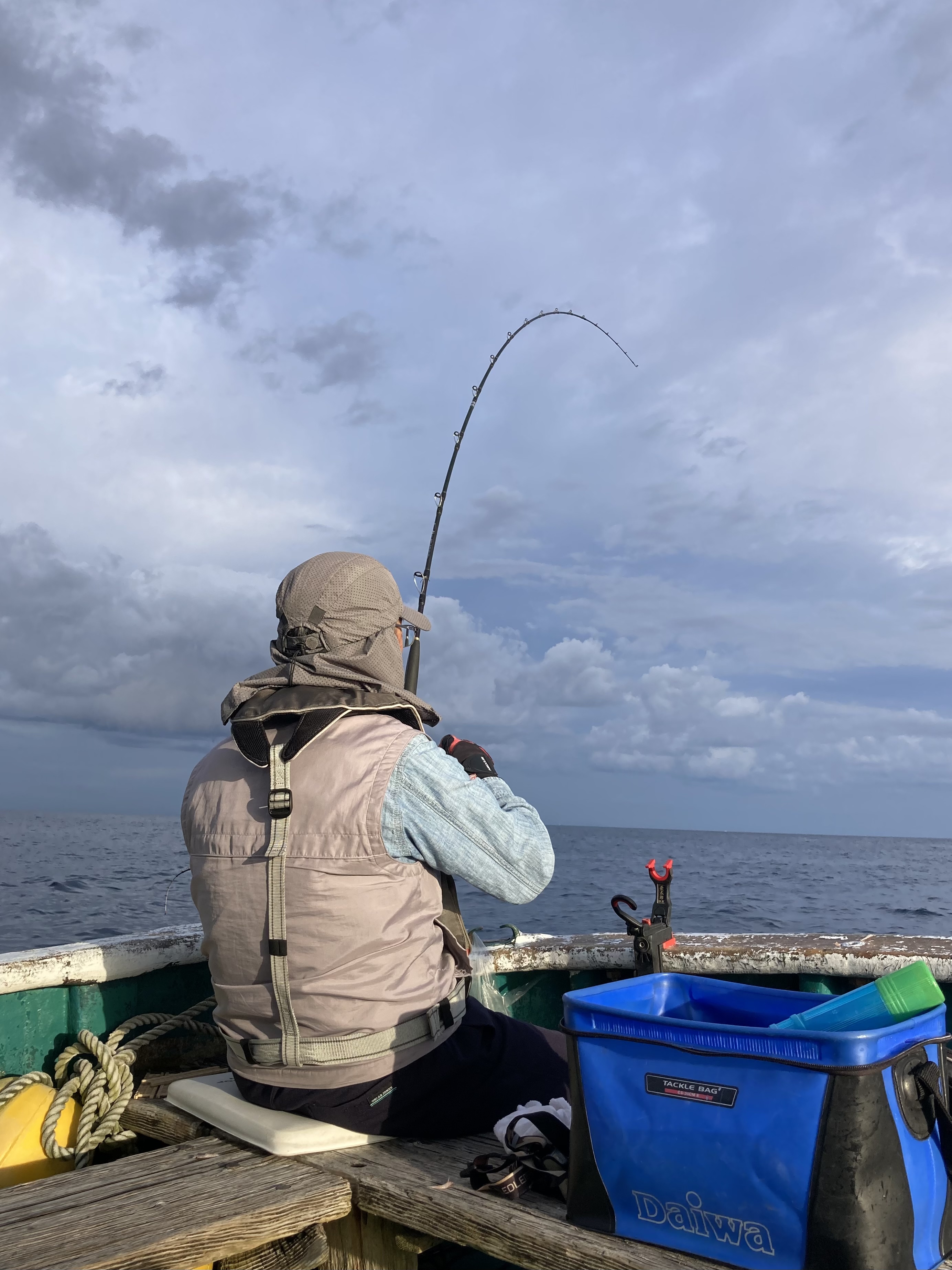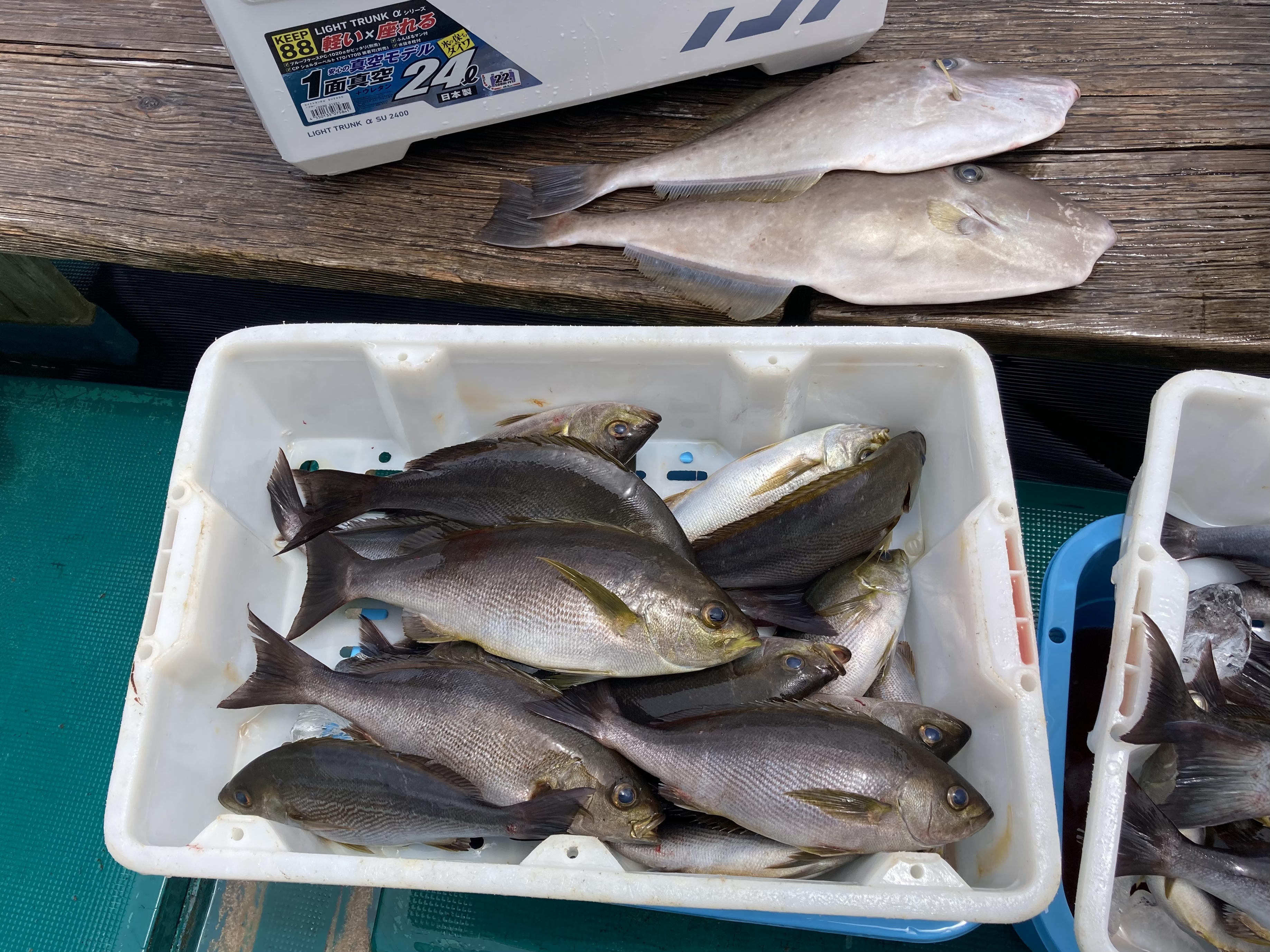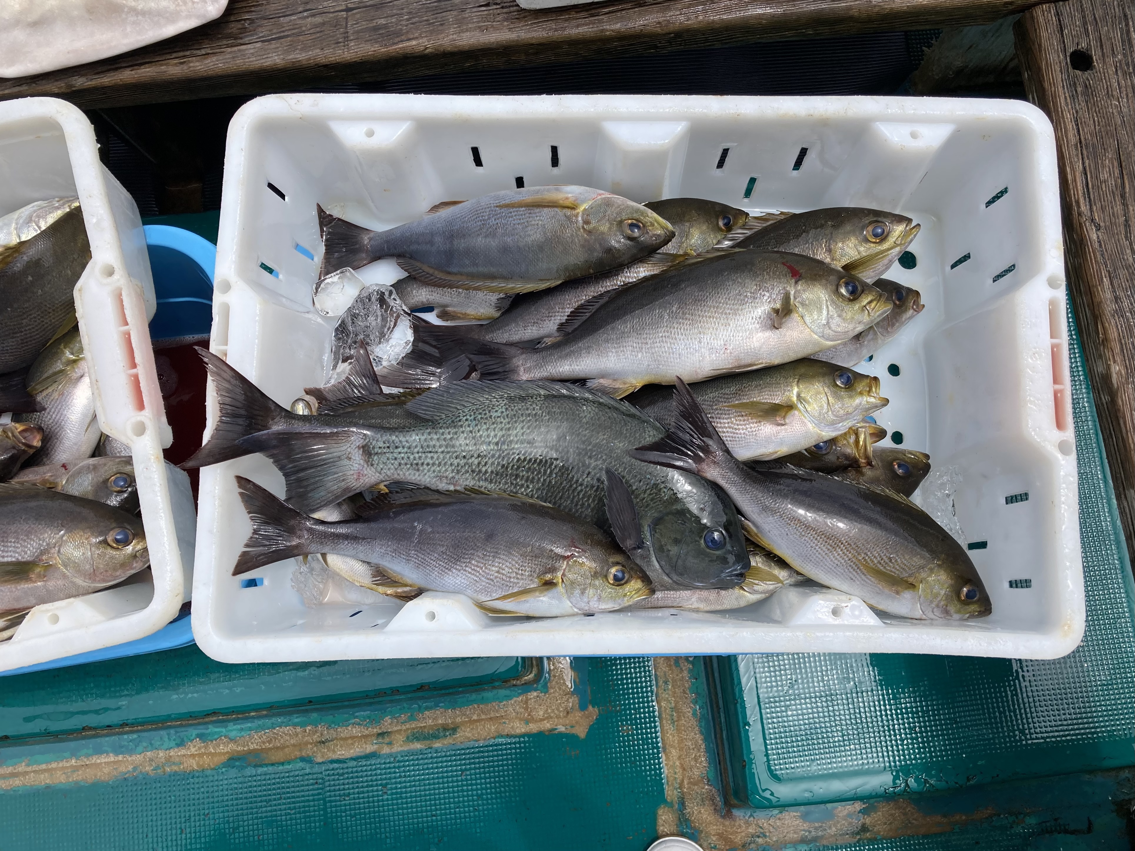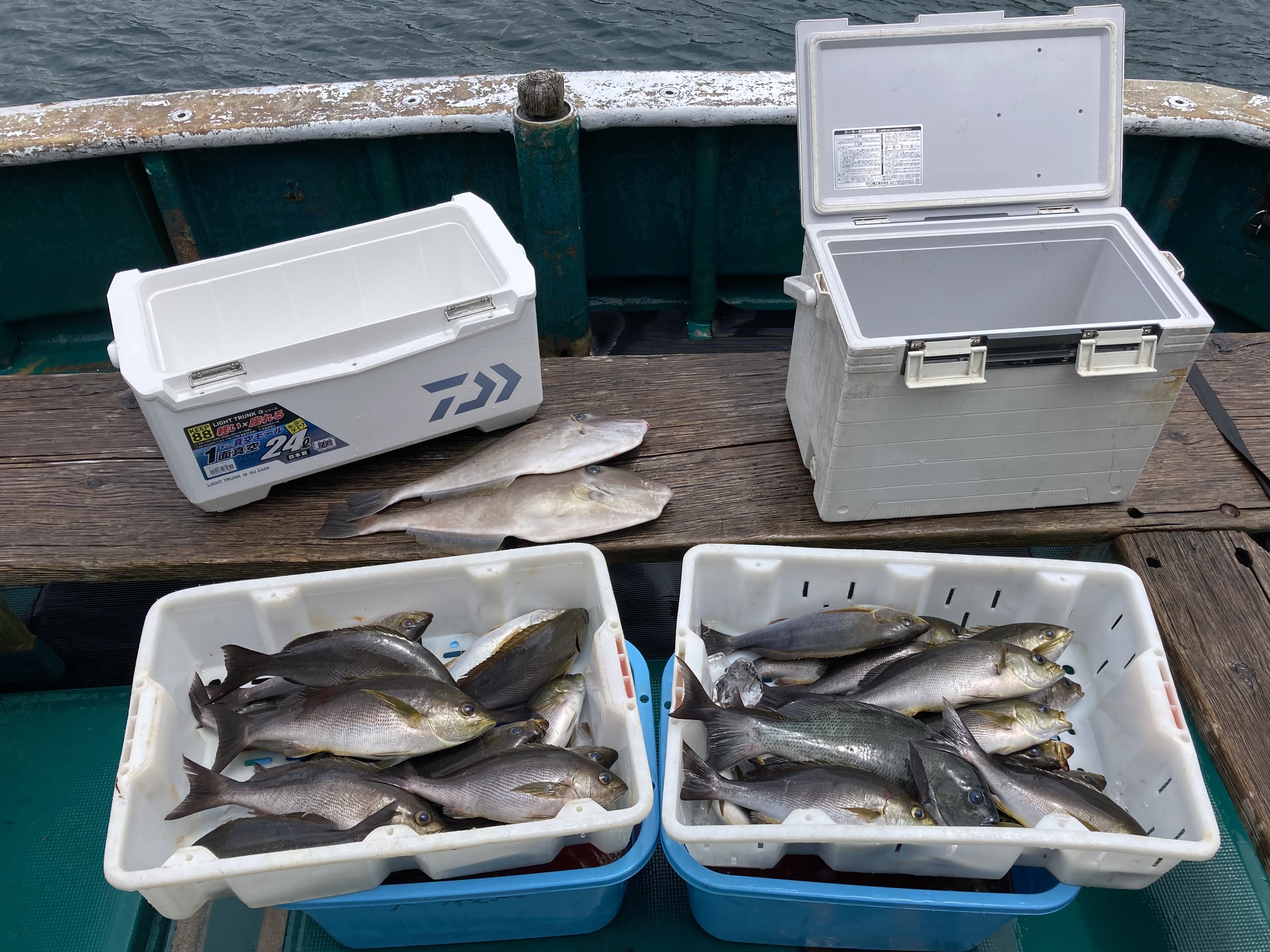 流れは緩い上り潮で釣り易かったです。喰いも良く、一投目から連続して釣り上げました。途中、流れが入れ上り潮に変わり海上温が少し上昇したぐらいから喰い気も落ちてしまい、道具もあれこれ(天秤フカセ・ウキカゴ釣り)と変えて頑張って釣りました。お疲れさまでした。また宜しくお願いいたします。