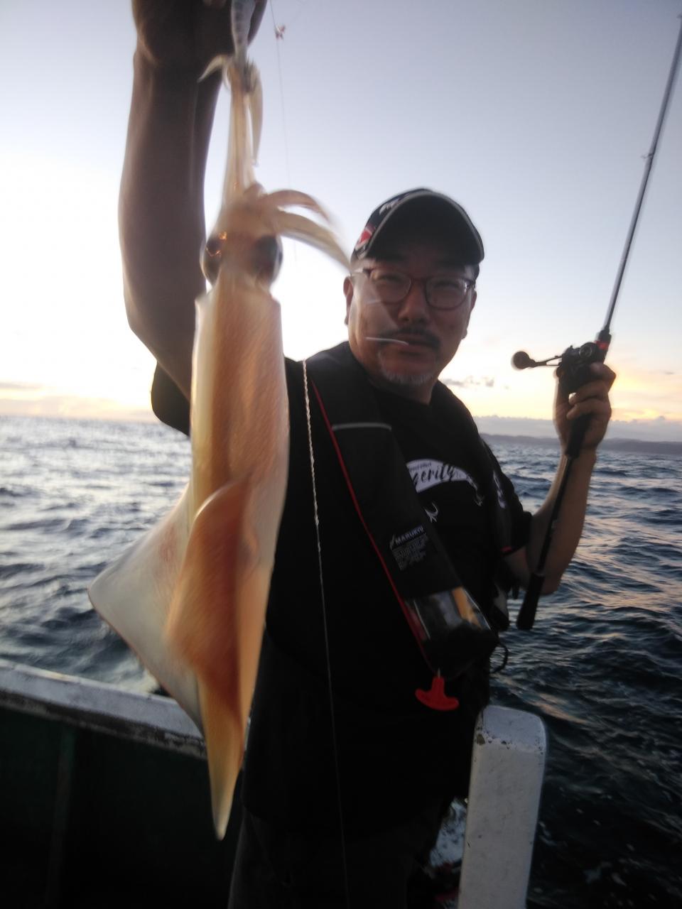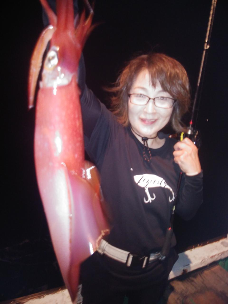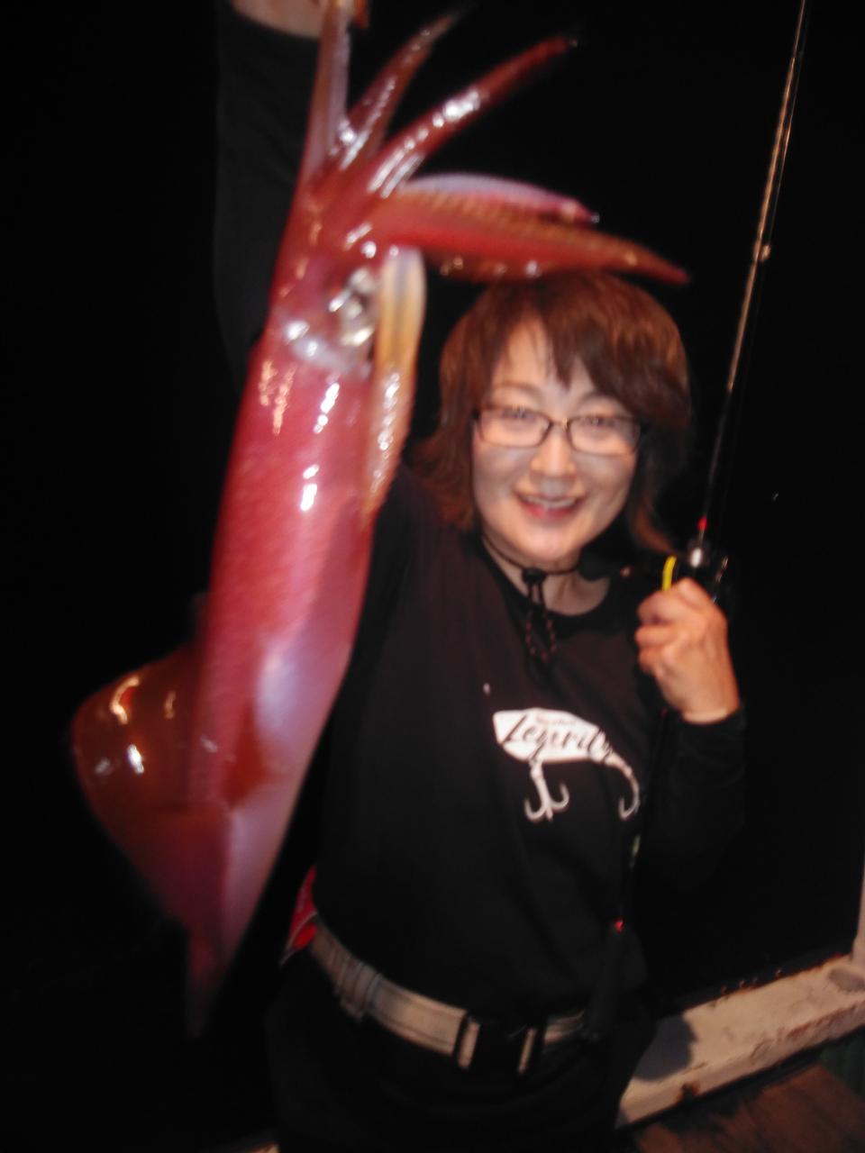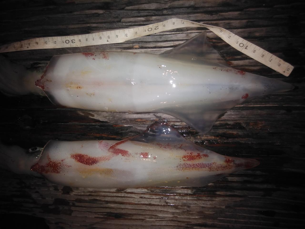 南東の風で、ゆっくりとした止まったような潮でした。喰い渋りの中、特大のアカイカ、37cm、38cm釣れました。スルメイカも交じりました。