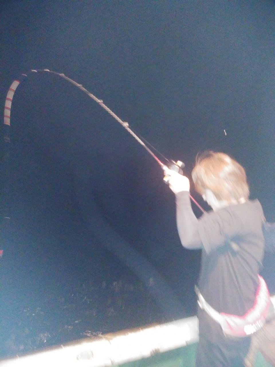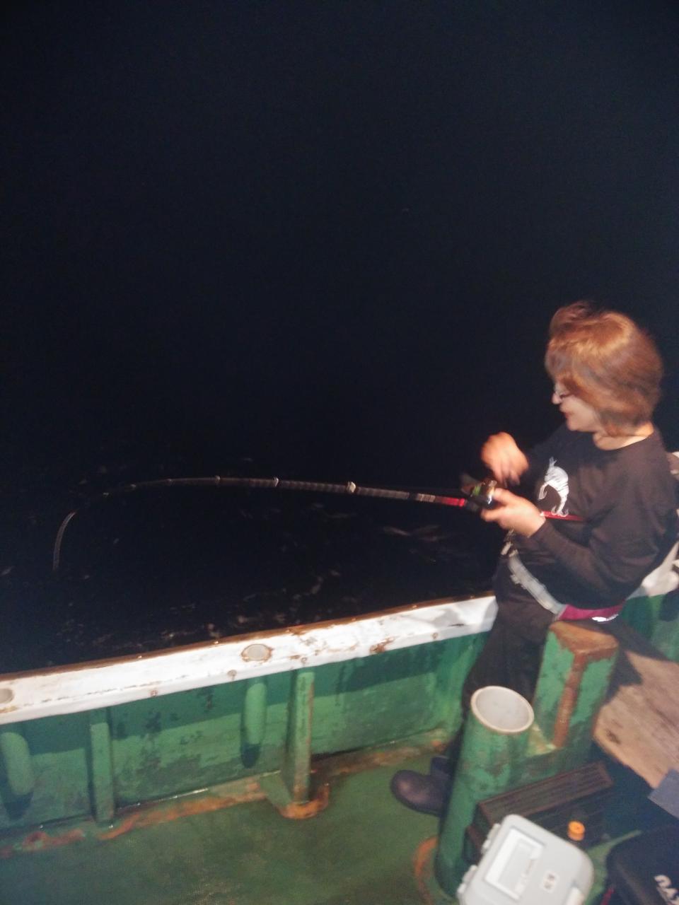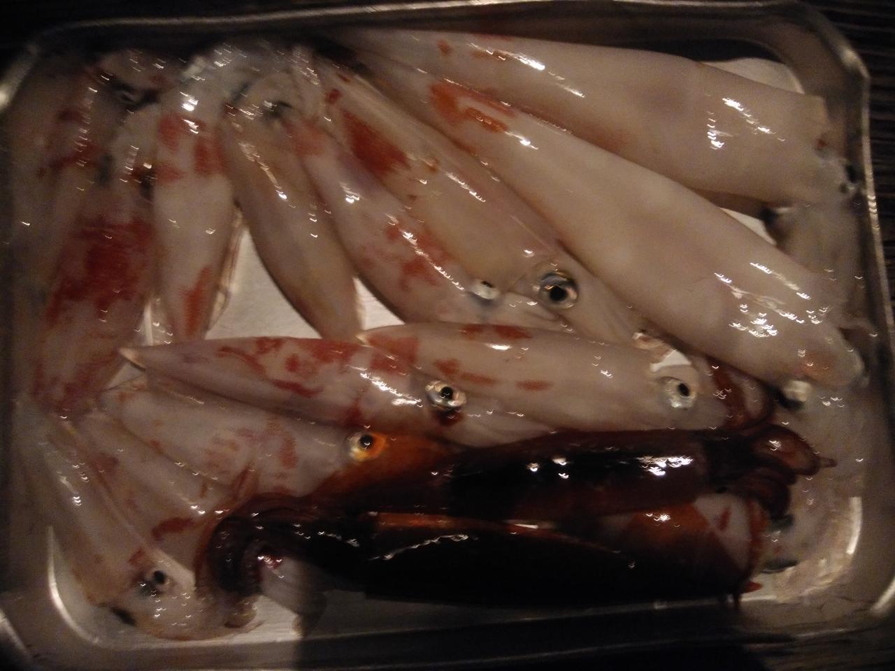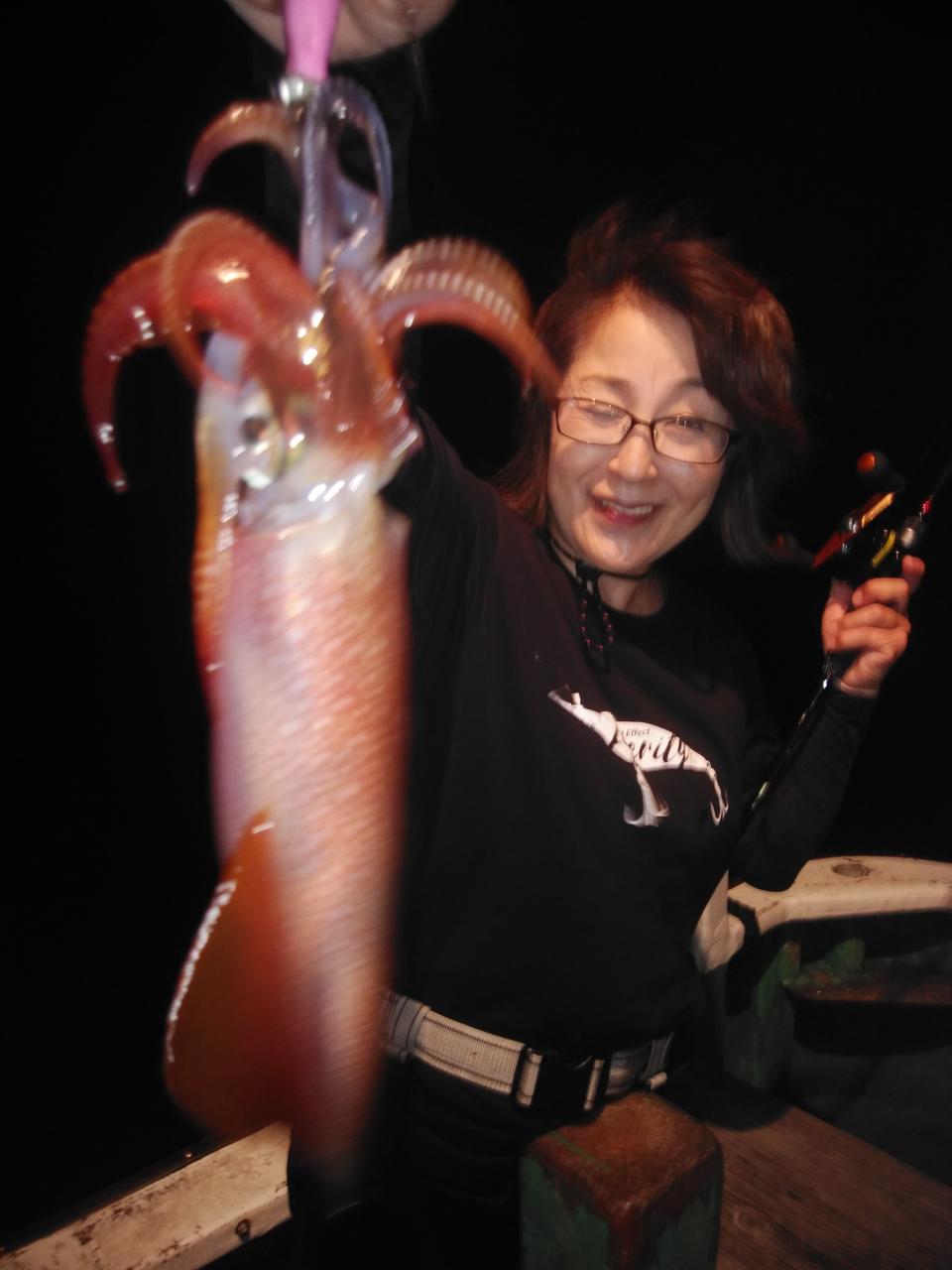 南東の風で、ゆっくりとした止まったような潮でした。喰い渋りの中、特大のアカイカ、37cm、38cm釣れました。スルメイカも交じりました。