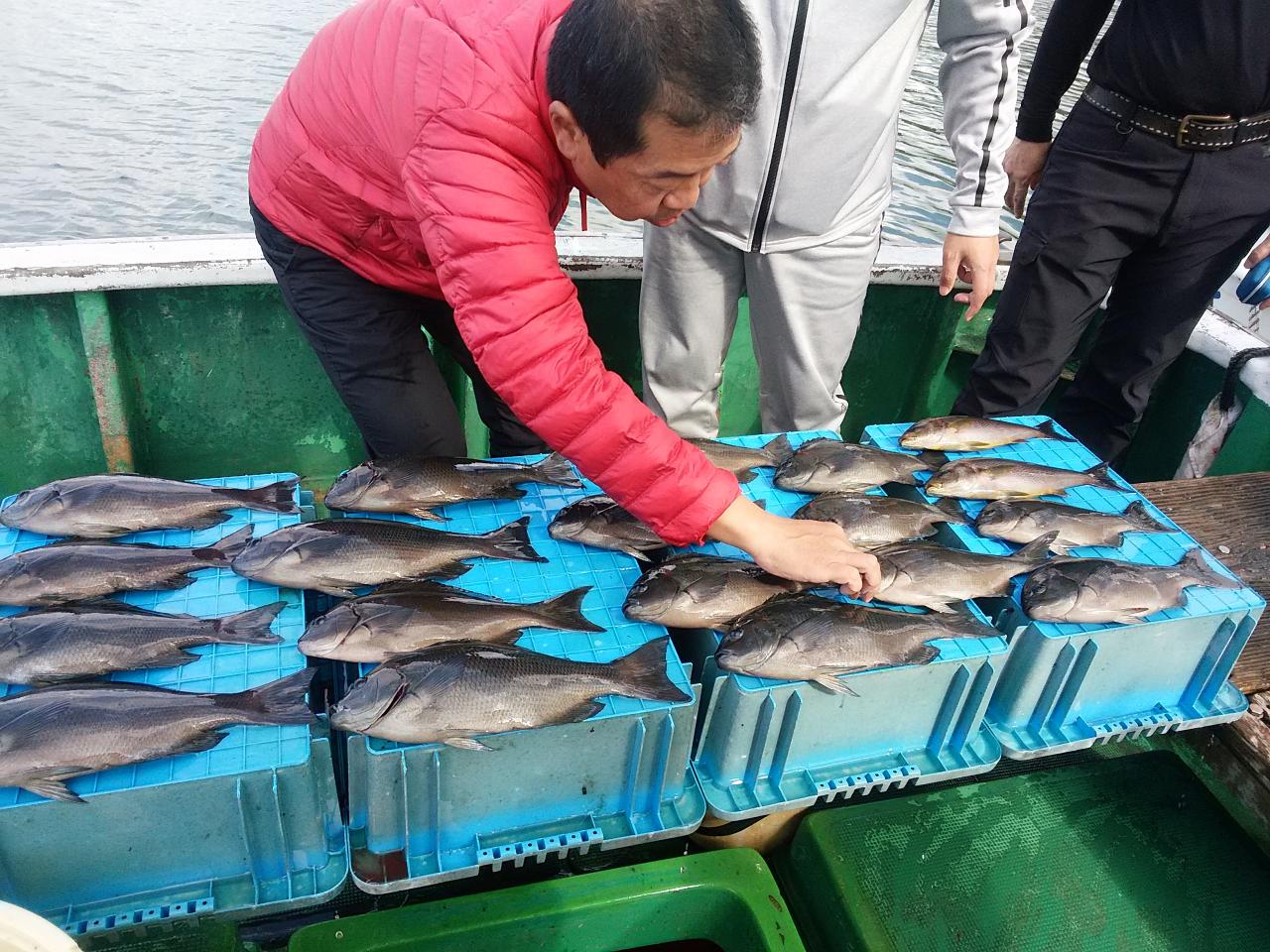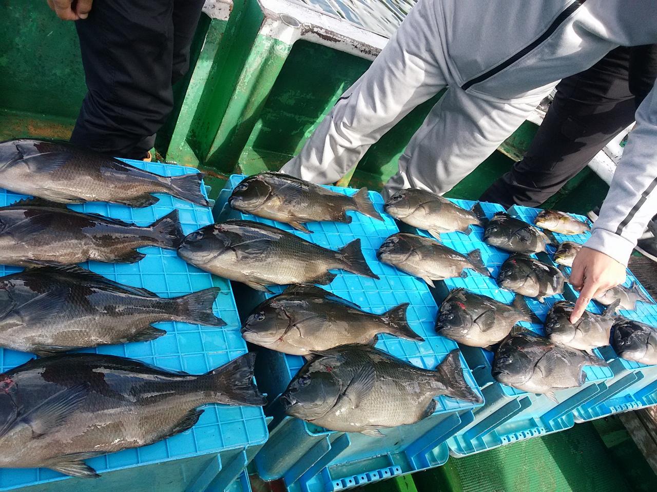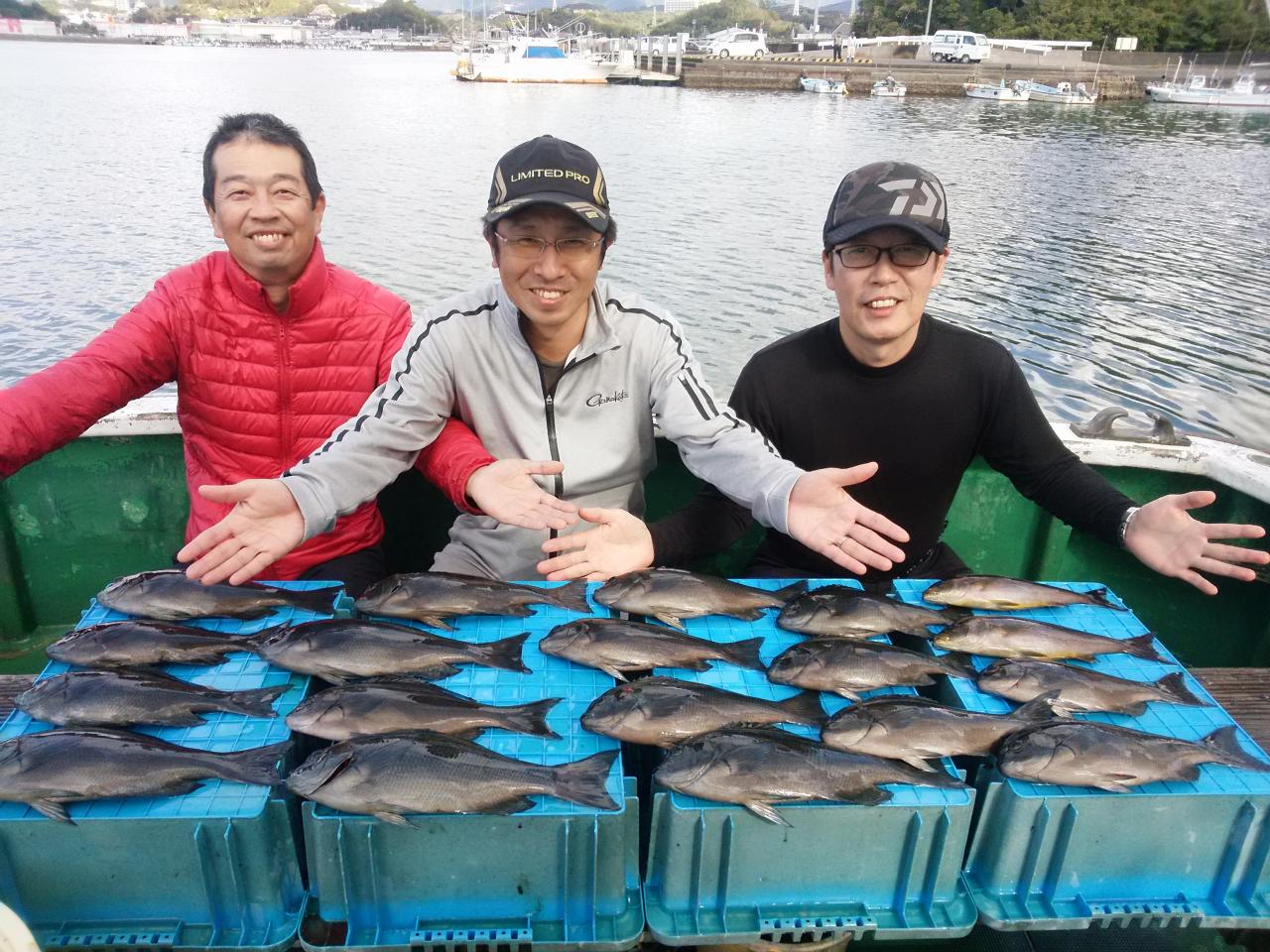 グレ、32~39㎝、17匹。イサギ、33~34㎝、2匹、イズスミ、サンノジ、ダツ、五目上がってよかったです。北の風で、下り潮でした。のちに、北西の風に、変わって来ましたが、徳山様ら、よく頑張ってくれて、グレ、39㎝頭に、17枚釣ってくれました。ありがとうございました。またお願いします。